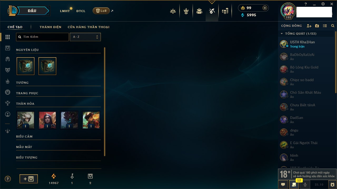 Rank Đơn: Bạc IIIKhung: Chưa có khungTướng: 171 - Còn 21493 THXTrang Phục: 252Rank ĐTCL: Bạch Kim IVLinh Thú: 123