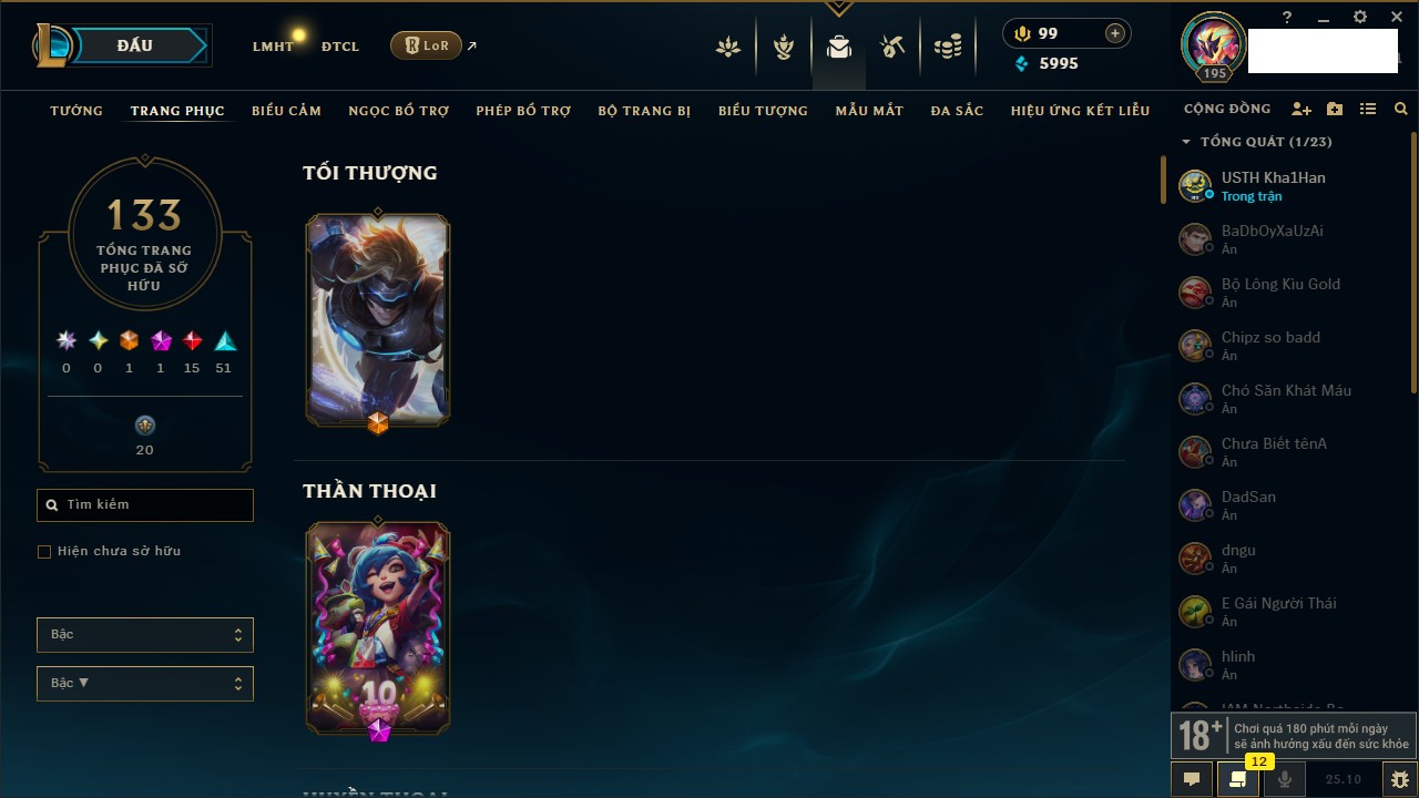 Rank Đơn: Vàng IIIKhung: VàngTướng: 161 - Còn 162202 THXTrang Phục: 179Rank ĐTCL: Chưa RankLinh Thú: 20