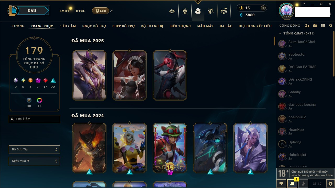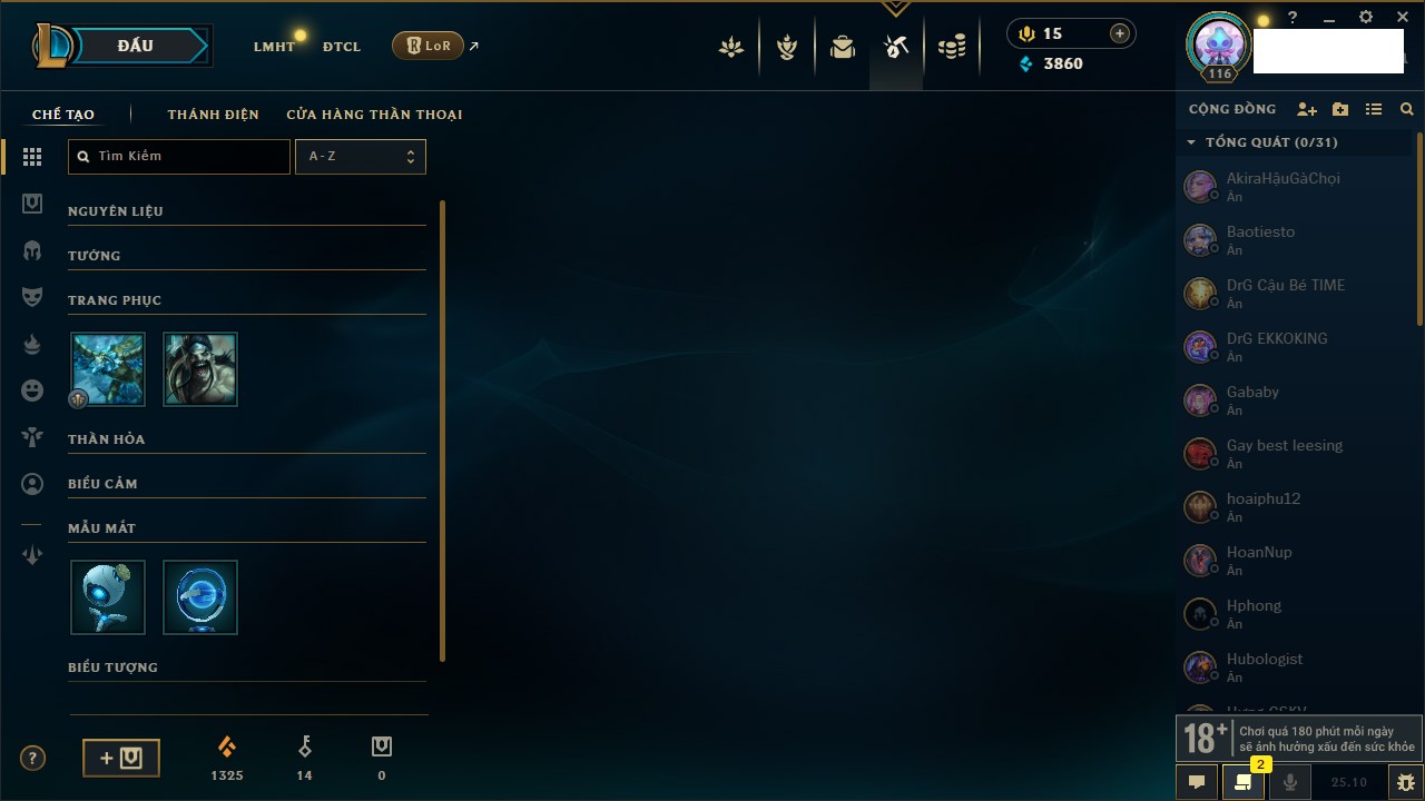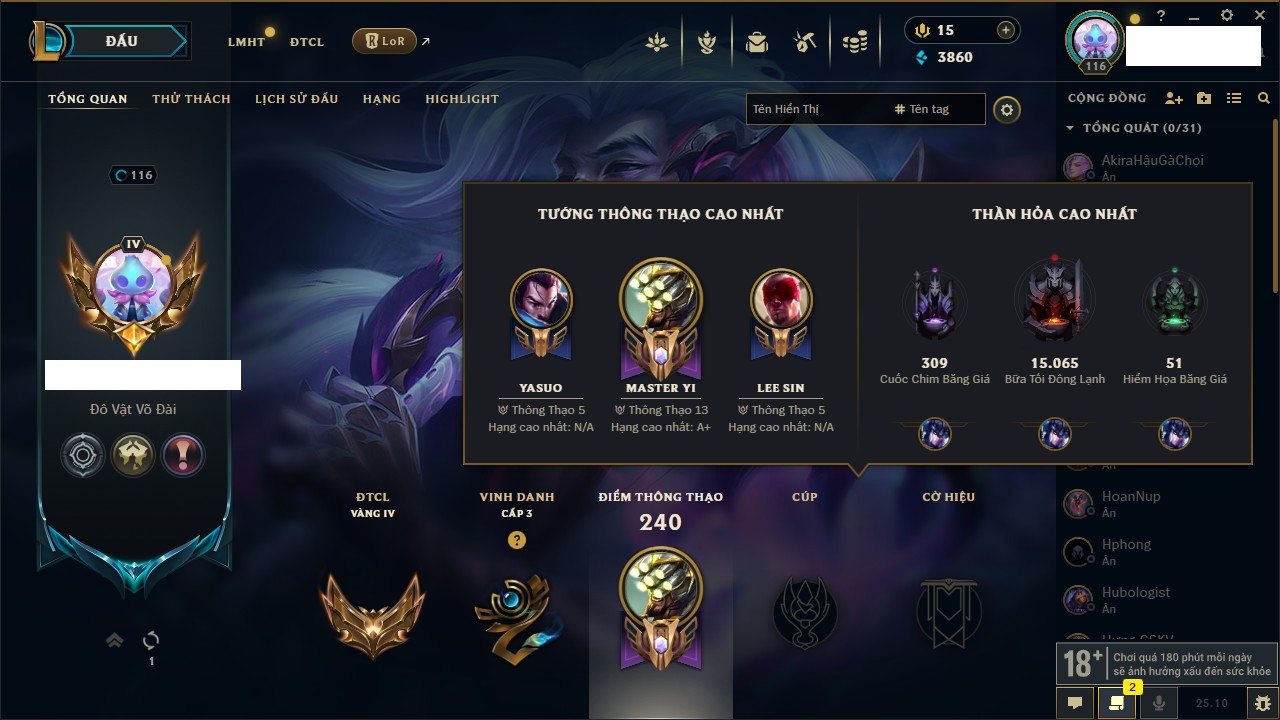 Rank Đơn: Bạch Kim IIKhung: Bạch kimTướng: 171 - Còn 315217 THXTrang Phục: 238Rank ĐTCL: Bạch Kim ILinh Thú: 116