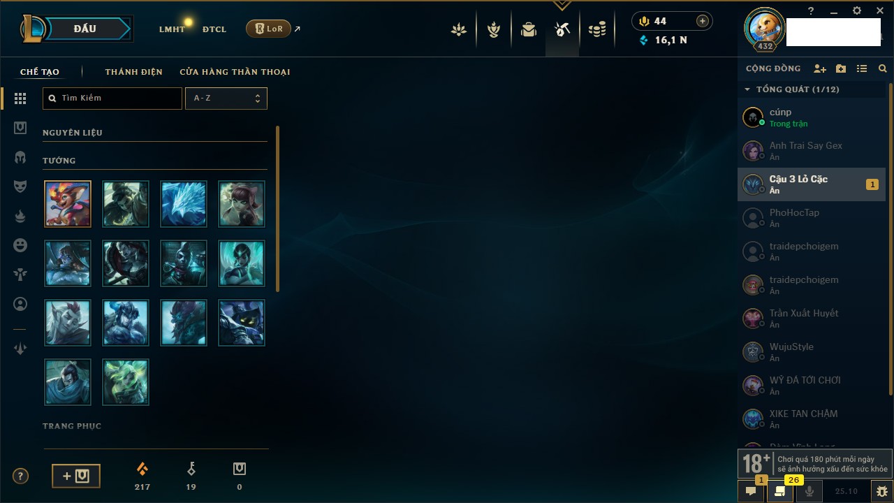 Rank Đơn: Bạc IIIKhung: BạcTướng: 171 - Còn 190352 THXTrang Phục: 260Rank ĐTCL: Sắt IILinh Thú: 31