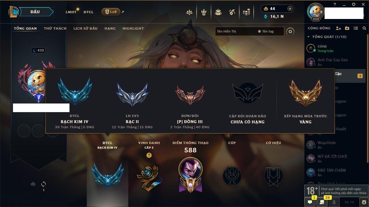 Rank Đơn: Lục Bảo IVKhung: VàngTướng: 171 - Còn 154648 THXTrang Phục: 203Rank ĐTCL: Bạch Kim IVLinh Thú: 69