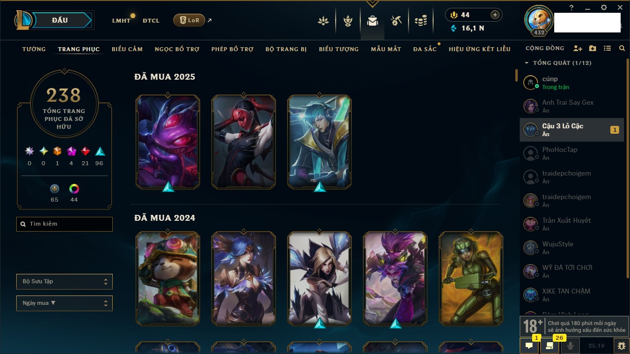 Rank Đơn: Vàng IIKhung: VàngTướng: 170 - Còn 243330 THXTrang Phục: 230Rank ĐTCL: Chưa RankLinh Thú: 68