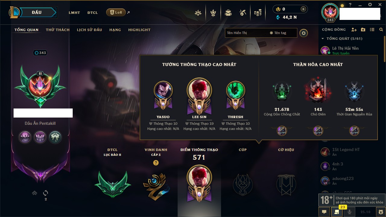 Rank Đơn: Chưa RankKhung: Chưa có khungTướng: 171 - Còn 164047 THXTrang Phục: 173Rank ĐTCL: Chưa RankLinh Thú: 77