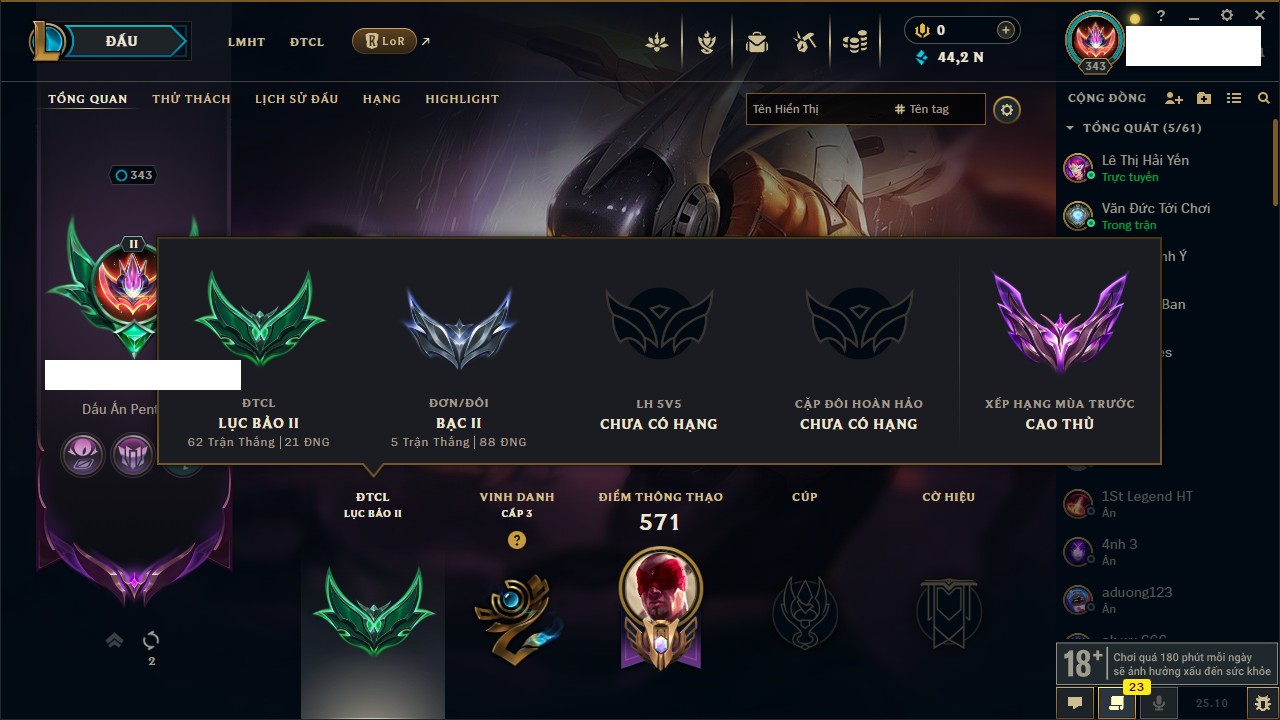 Rank Đơn: Chưa RankKhung: Bạch kimTướng: 172 - Còn 179290 THXTrang Phục: 187Rank ĐTCL: Chưa RankLinh Thú: 49