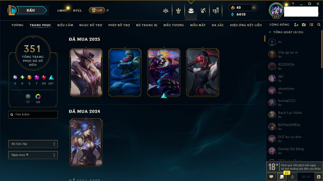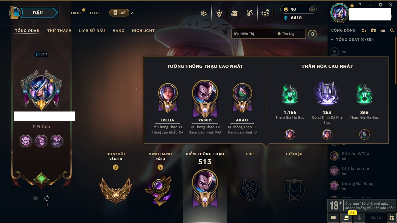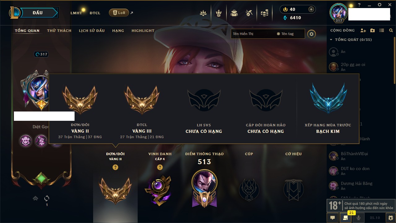 Rank Đơn: Vàng IKhung: Bạch kimTướng: 170 - Còn 212450 THXTrang Phục: 214Rank ĐTCL: Bạch Kim IVLinh Thú: 221