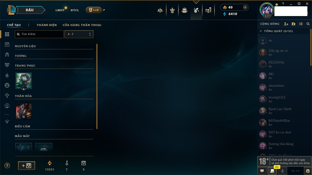 Rank Đơn: Bạch Kim IVKhung: Bạch kimTướng: 171 - Còn 182788 THXTrang Phục: 158Rank ĐTCL: Lục Bảo IVLinh Thú: 56