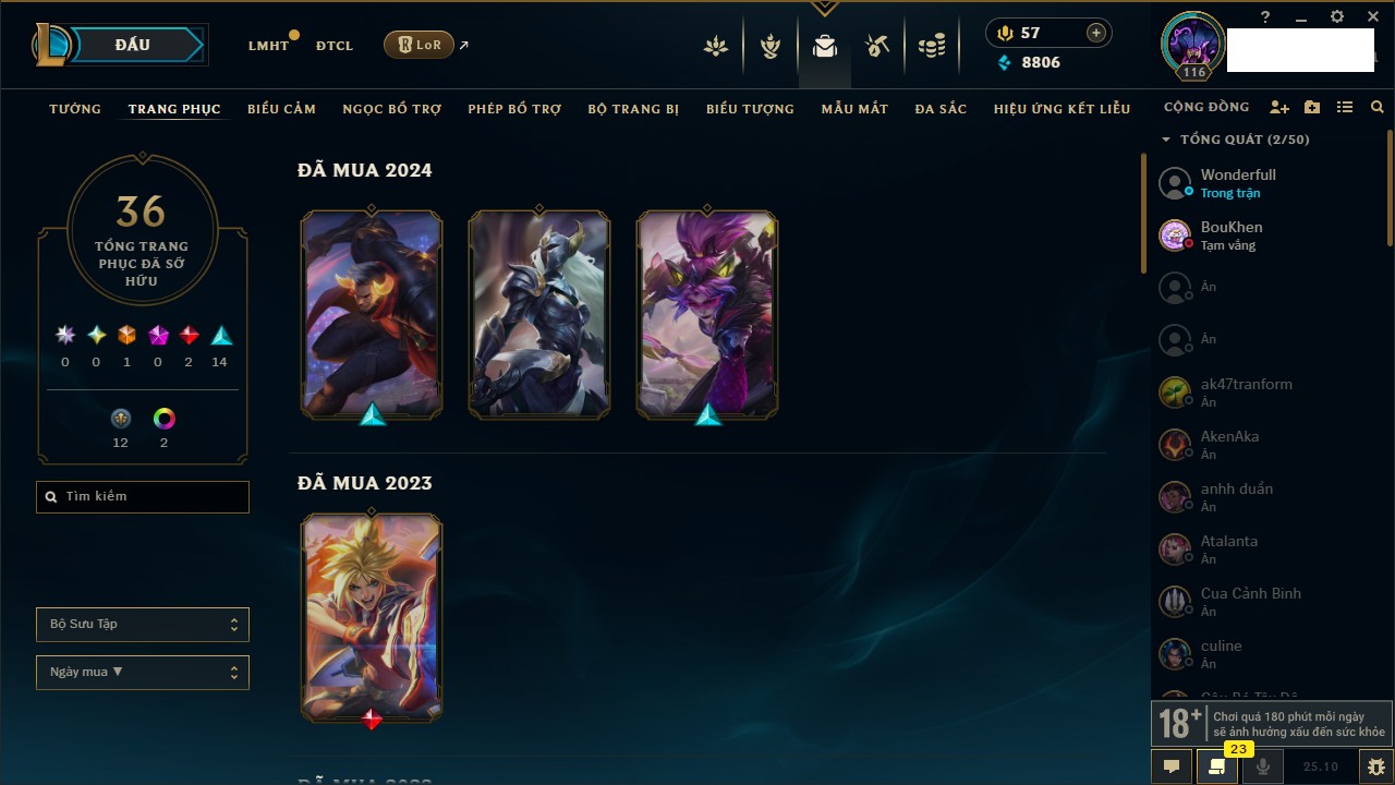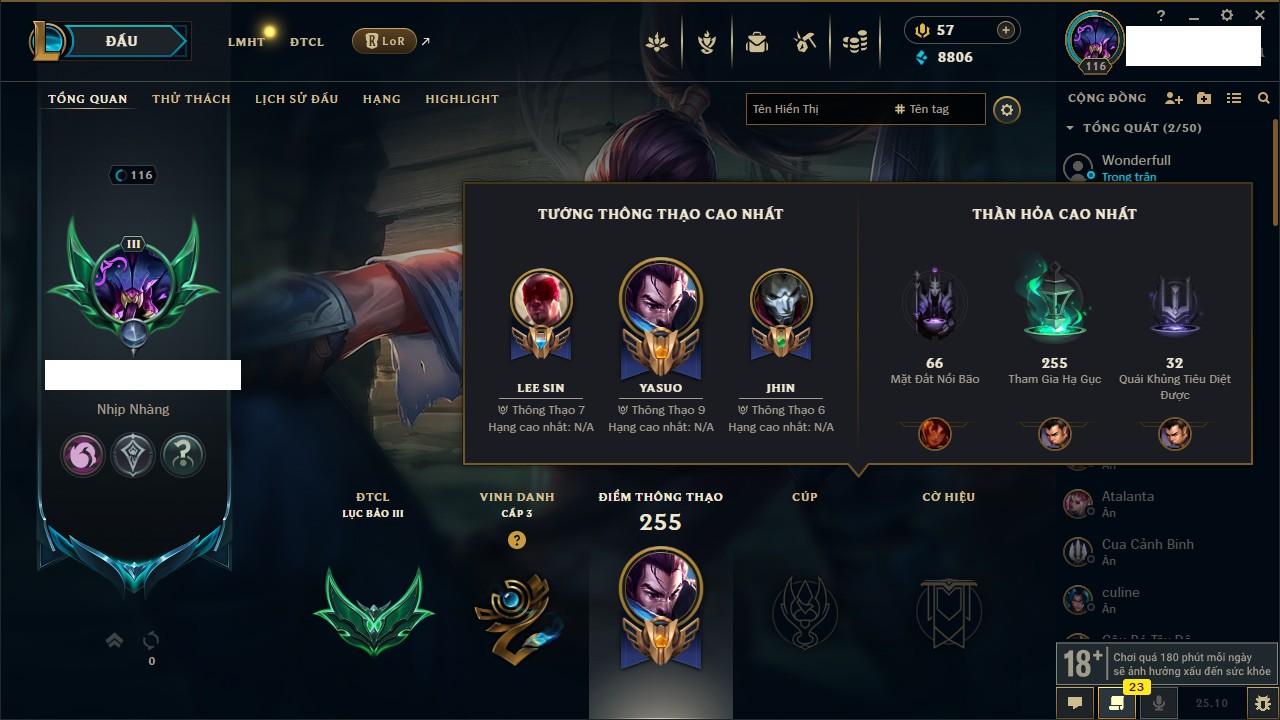 Rank Đơn: Vàng IVKhung: VàngTướng: 171 - Còn 48721 THXTrang Phục: 171Rank ĐTCL: Chưa RankLinh Thú: 27