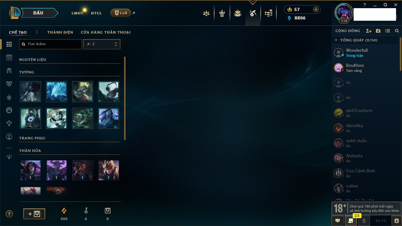 Rank Đơn: Vàng IVKhung: BạcTướng: 166 - Còn 180925 THXTrang Phục: 163Rank ĐTCL: Chưa RankLinh Thú: 67