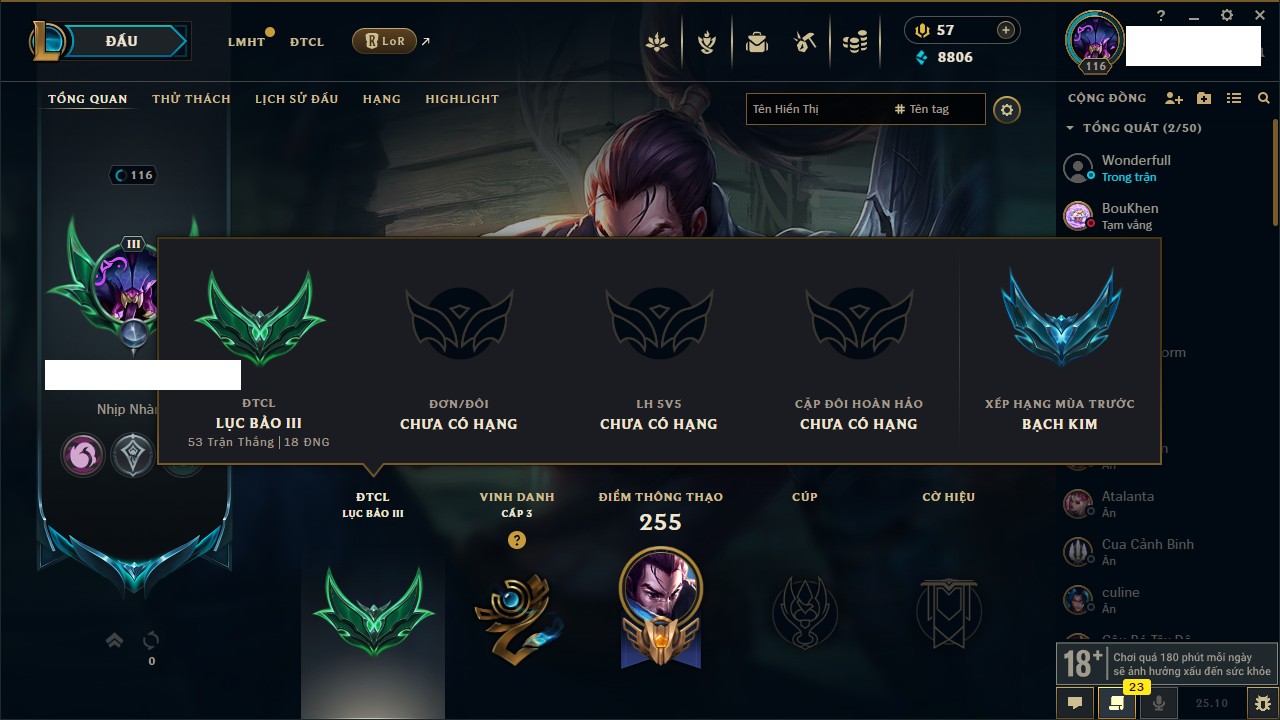 Rank Đơn: Bạc IIKhung: VàngTướng: 171 - Còn 332462 THXTrang Phục: 165Rank ĐTCL: Kim Cương IVLinh Thú: 181