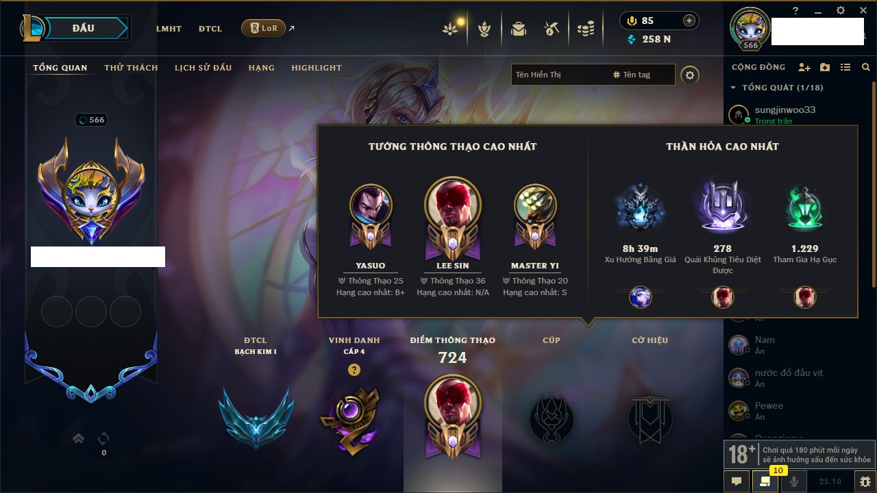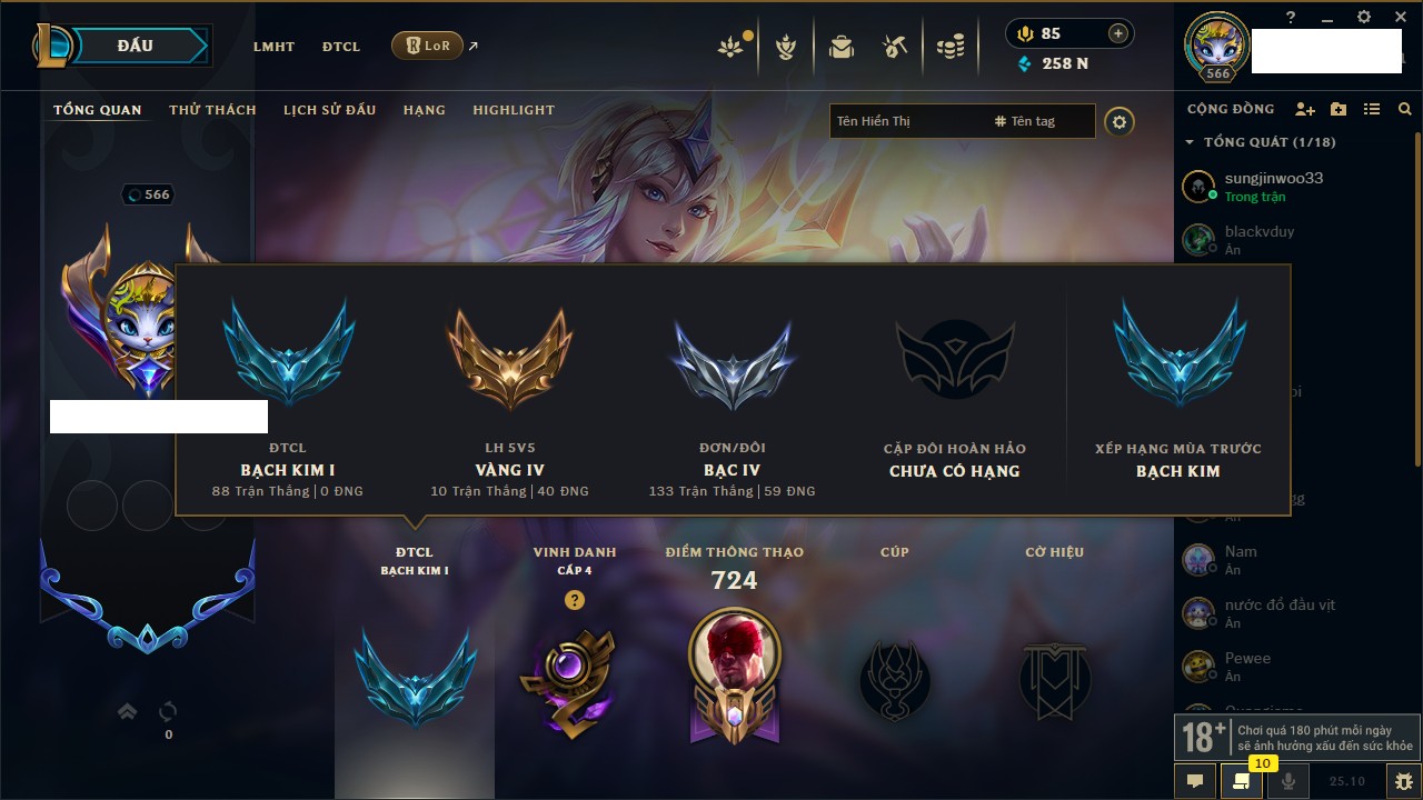 Rank Đơn: Bạch Kim IVKhung: Chưa có khungTướng: 172 - Còn 29488 THXTrang Phục: 120Rank ĐTCL: Bạc IIILinh Thú: 50