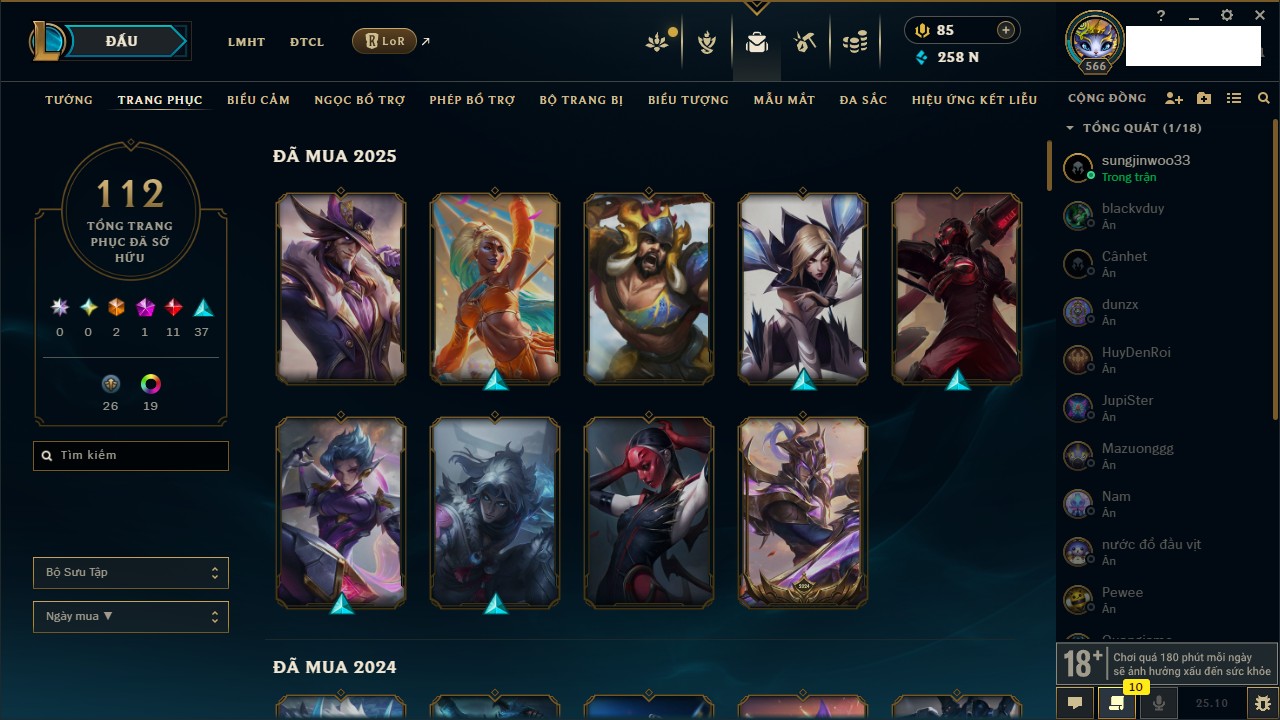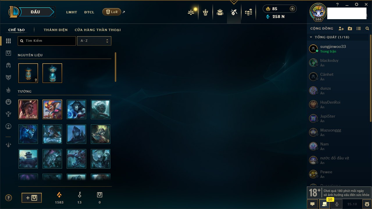 Rank Đơn: Vàng IVKhung: BạcTướng: 167 - Còn 16342 THXTrang Phục: 159Rank ĐTCL: Chưa RankLinh Thú: 88