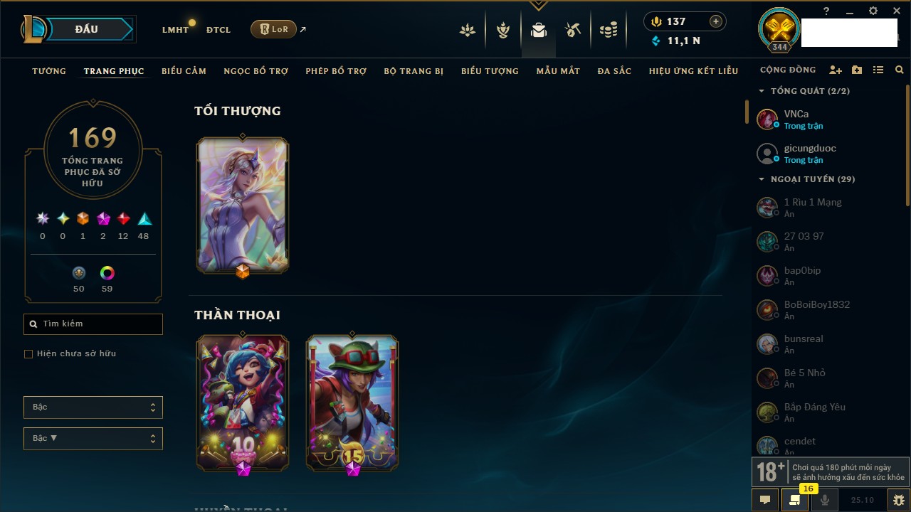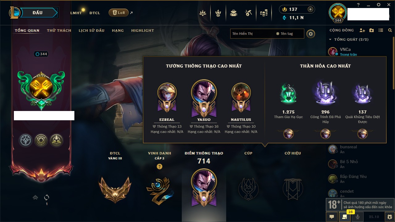 Rank Đơn: Đồng IIIKhung: Chưa có khungTướng: 152 - Còn 6423 THXTrang Phục: 160Rank ĐTCL: Chưa RankLinh Thú: 107