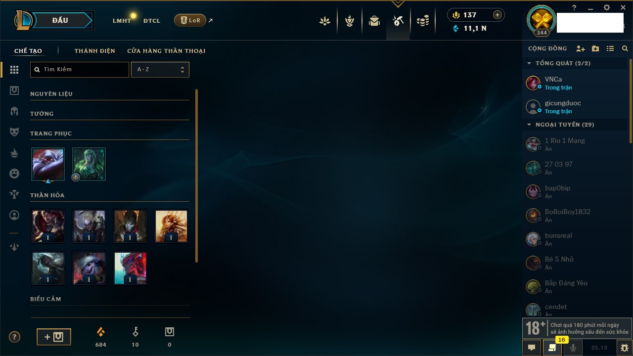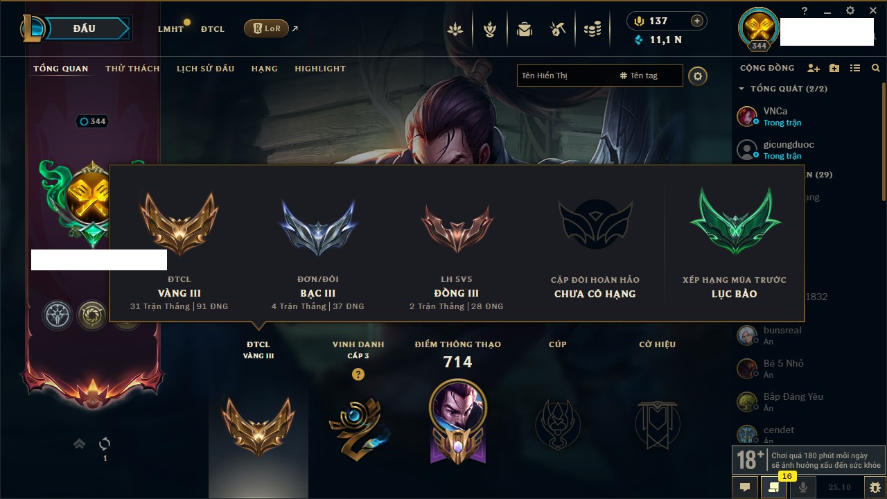 Rank Đơn: Bạc IVKhung: BạcTướng: 171 - Còn 43794 THXTrang Phục: 136Rank ĐTCL: Bạch Kim IVLinh Thú: 108