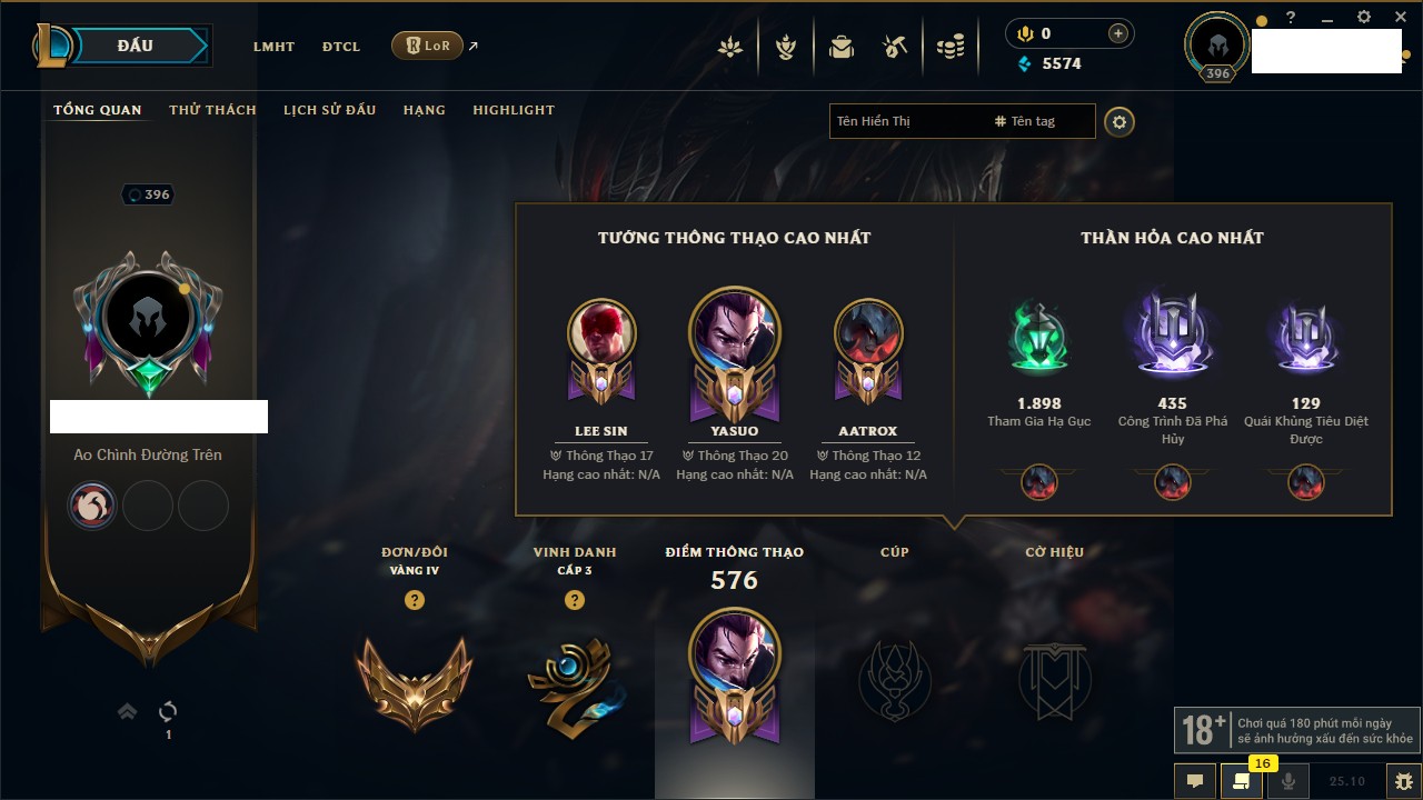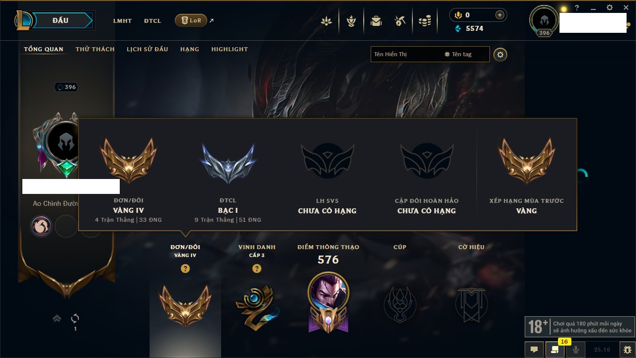Rank Đơn: Vàng IIKhung: Bạch kimTướng: 172 - Còn 123420 THXTrang Phục: 231Rank ĐTCL: Bạch Kim IVLinh Thú: 213