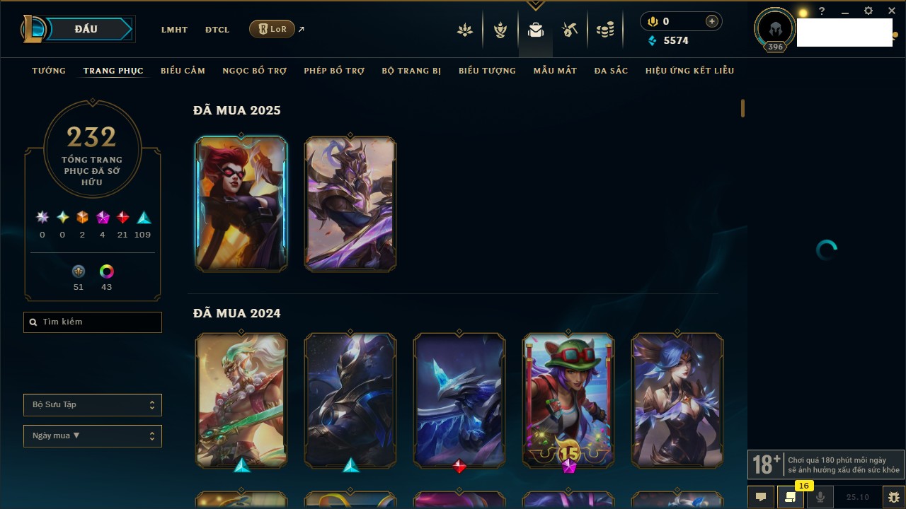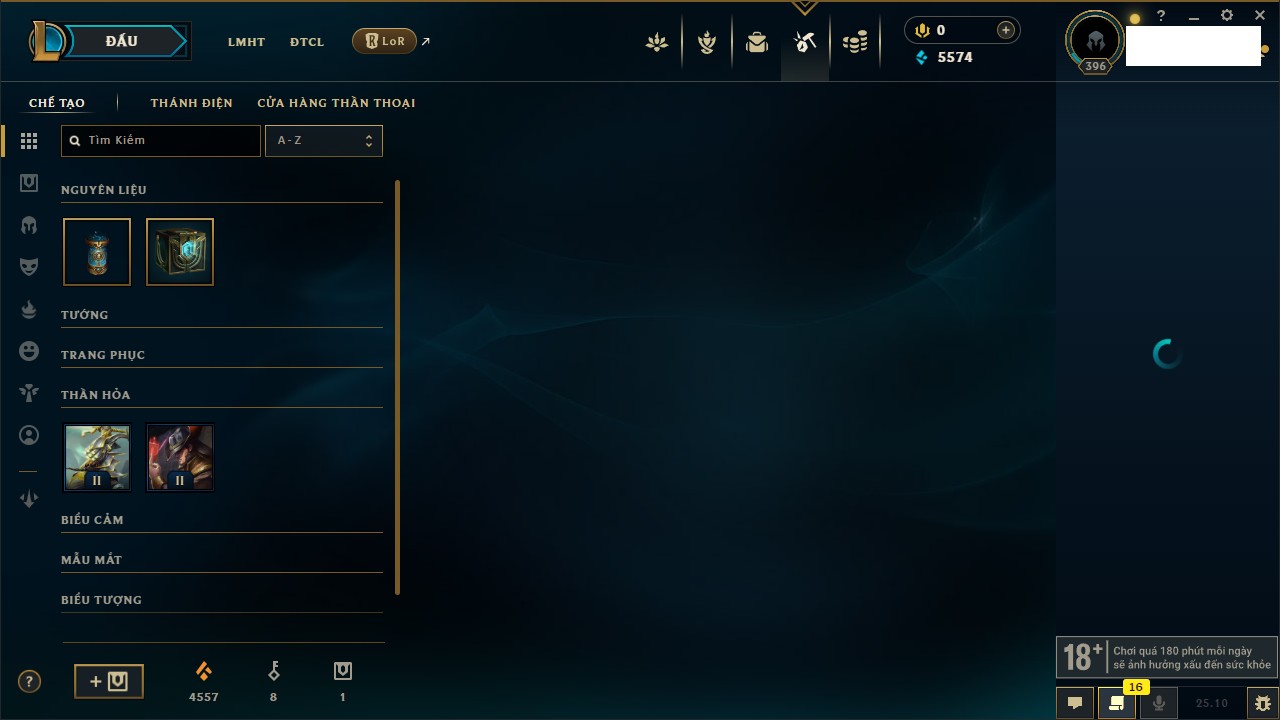 Rank Đơn: Vàng IIIKhung: VàngTướng: 172 - Còn 200315 THXTrang Phục: 87Rank ĐTCL: Chưa RankLinh Thú: 136