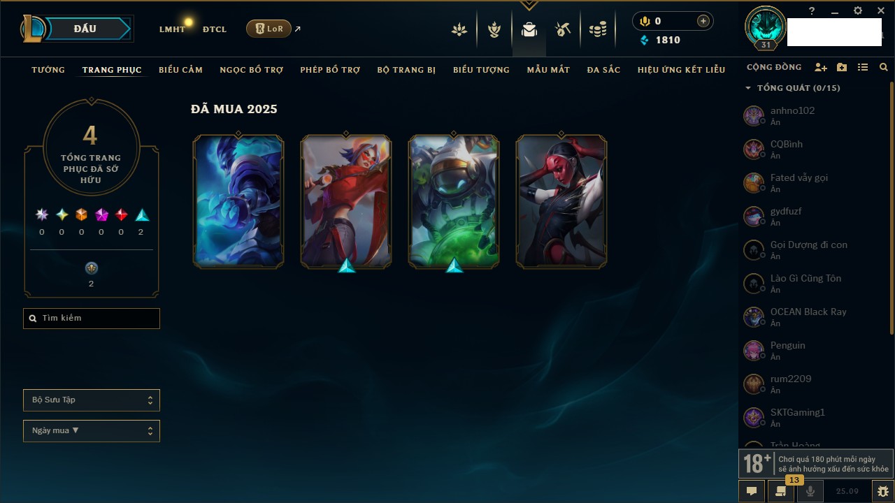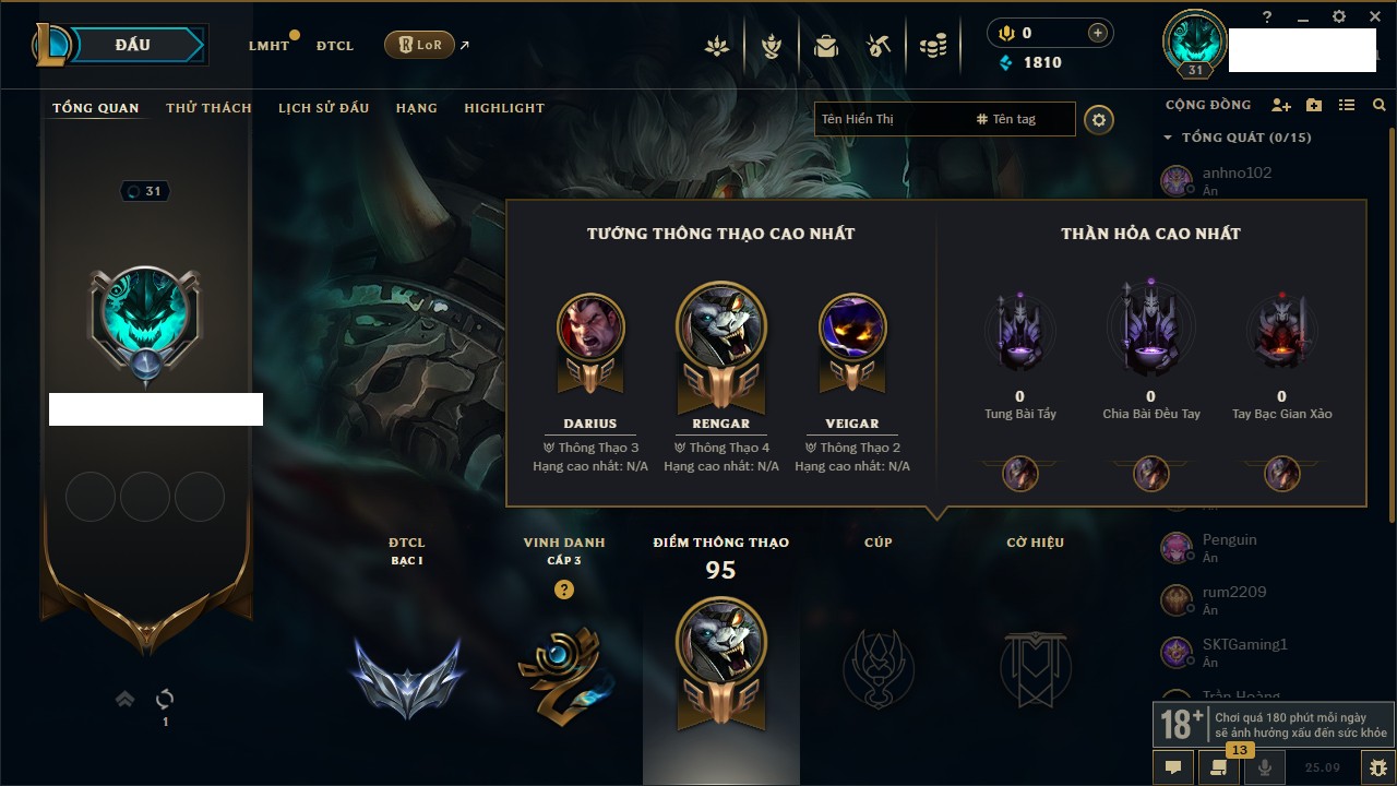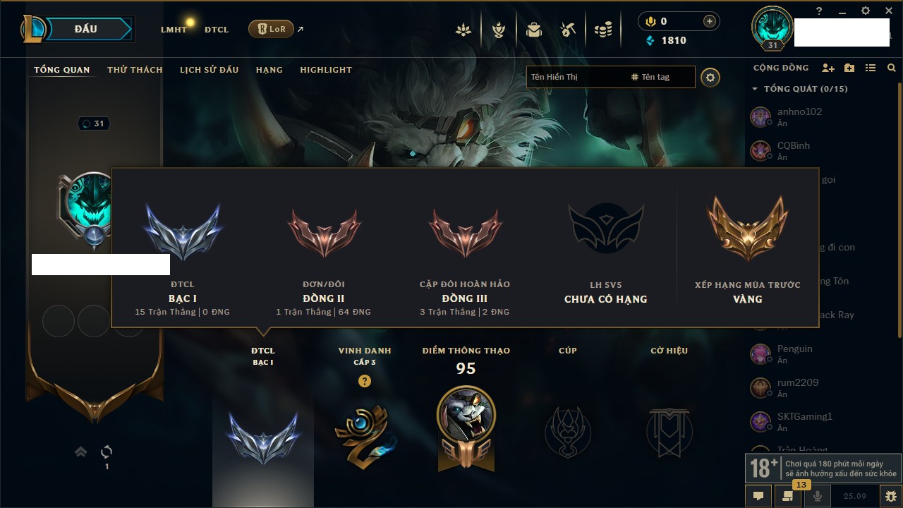 Rank Đơn: Đồng IIKhung: Chưa có khungTướng: 170 - Còn 2078 THXTrang Phục: 72Rank ĐTCL: Đồng ILinh Thú: 133
