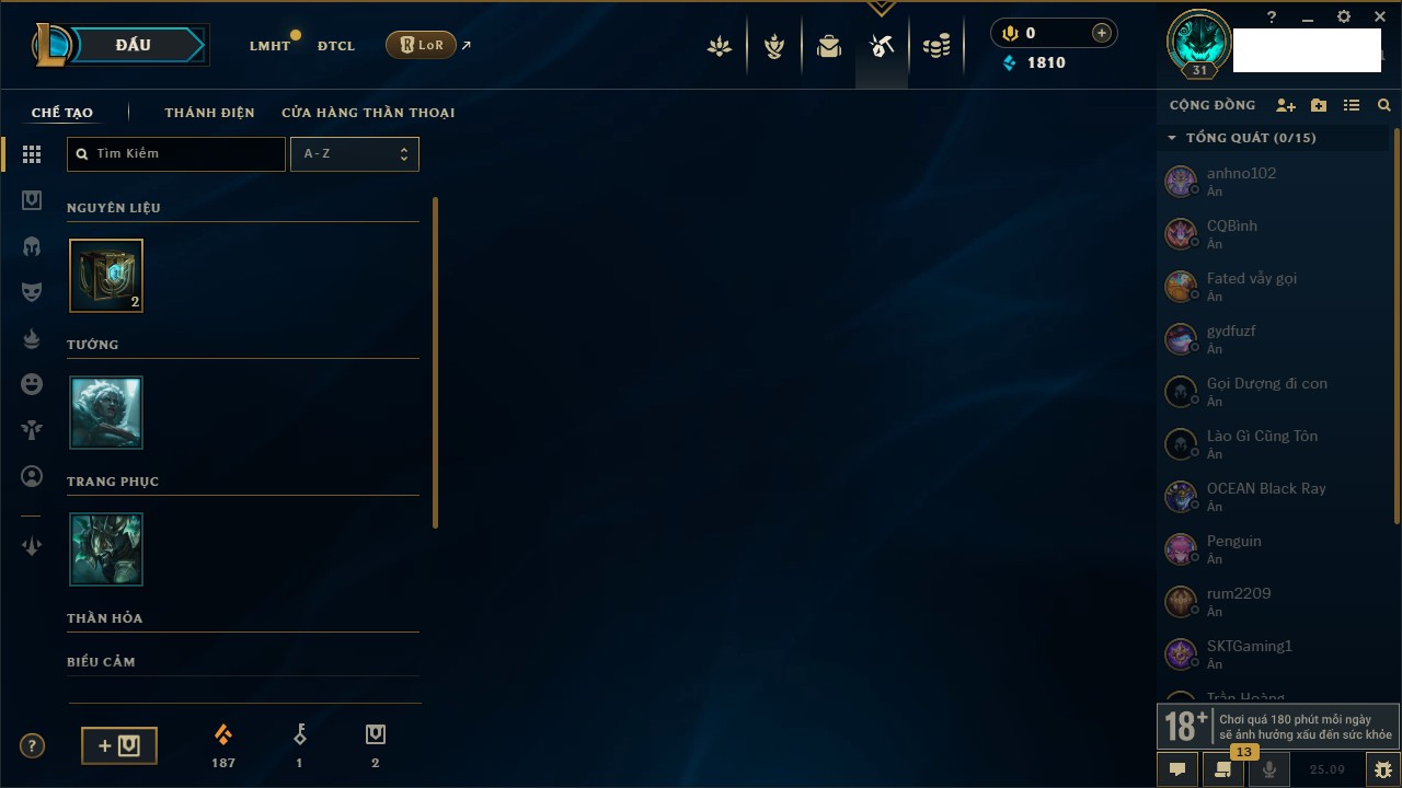 Rank Đơn: Bạc IIIKhung: BạcTướng: 171 - Còn 190352 THXTrang Phục: 260Rank ĐTCL: Sắt IILinh Thú: 31