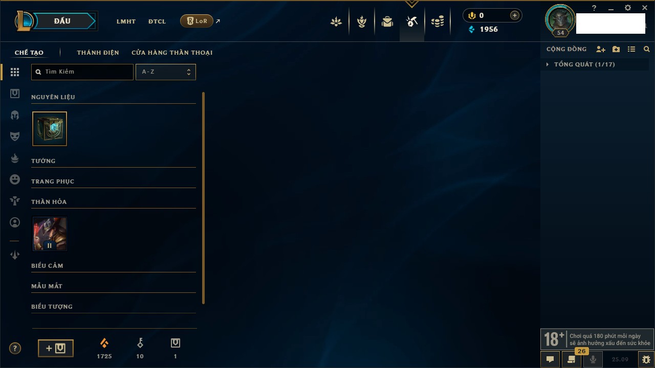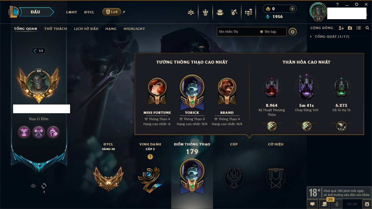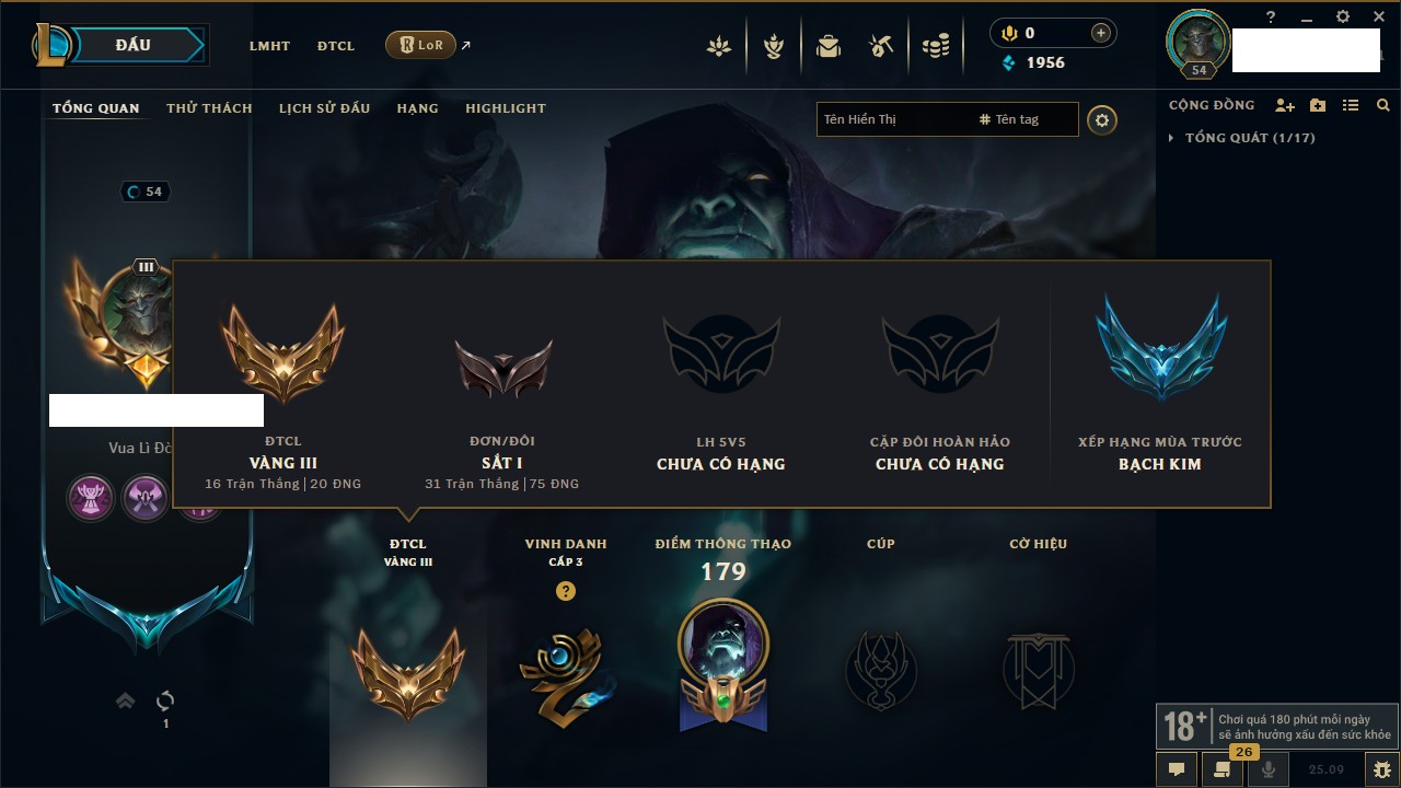 Rank Đơn: Đồng IKhung: Chưa có khungTướng: 130 - Còn 4038 THXTrang Phục: 151Rank ĐTCL: Chưa RankLinh Thú: 45