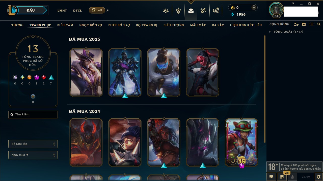 Rank Đơn: Chưa RankKhung: Chưa có khungTướng: 166 - Còn 81290 THXTrang Phục: 69Rank ĐTCL: Chưa RankLinh Thú: 53