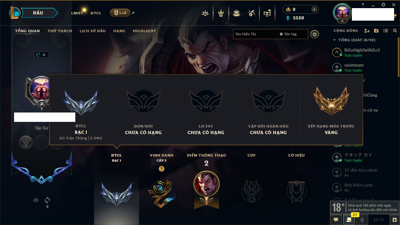 Rank Đơn: Bạch Kim IVKhung: Bạch kimTướng: 171 - Còn 182788 THXTrang Phục: 158Rank ĐTCL: Lục Bảo IVLinh Thú: 56