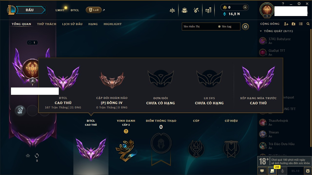 Rank Đơn: Chưa rank mùa nàoKhung: Chưa có khungTướng: 2 - Còn 9000 THXTrang Phục: 0Rank ĐTCL: Bạch Kim IIILinh Thú: 31