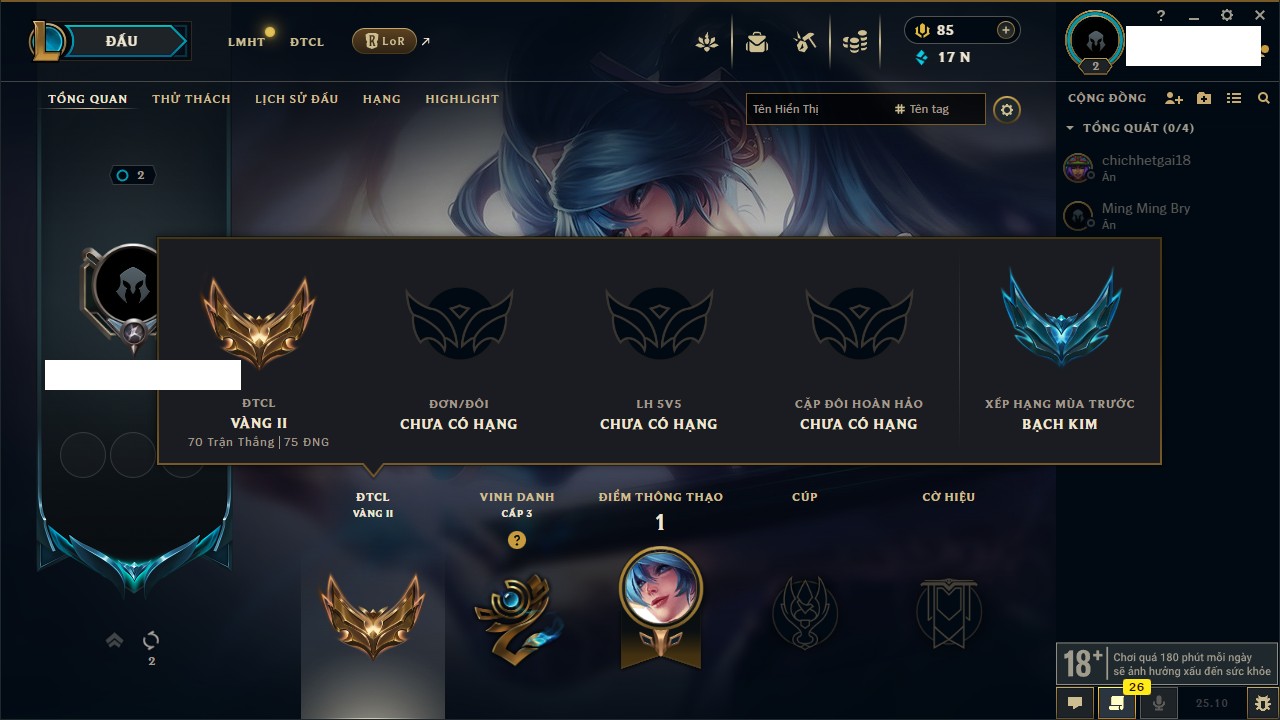 Rank Đơn: Bạch Kim IVKhung: Bạch kimTướng: 171 - Còn 182788 THXTrang Phục: 158Rank ĐTCL: Lục Bảo IVLinh Thú: 56
