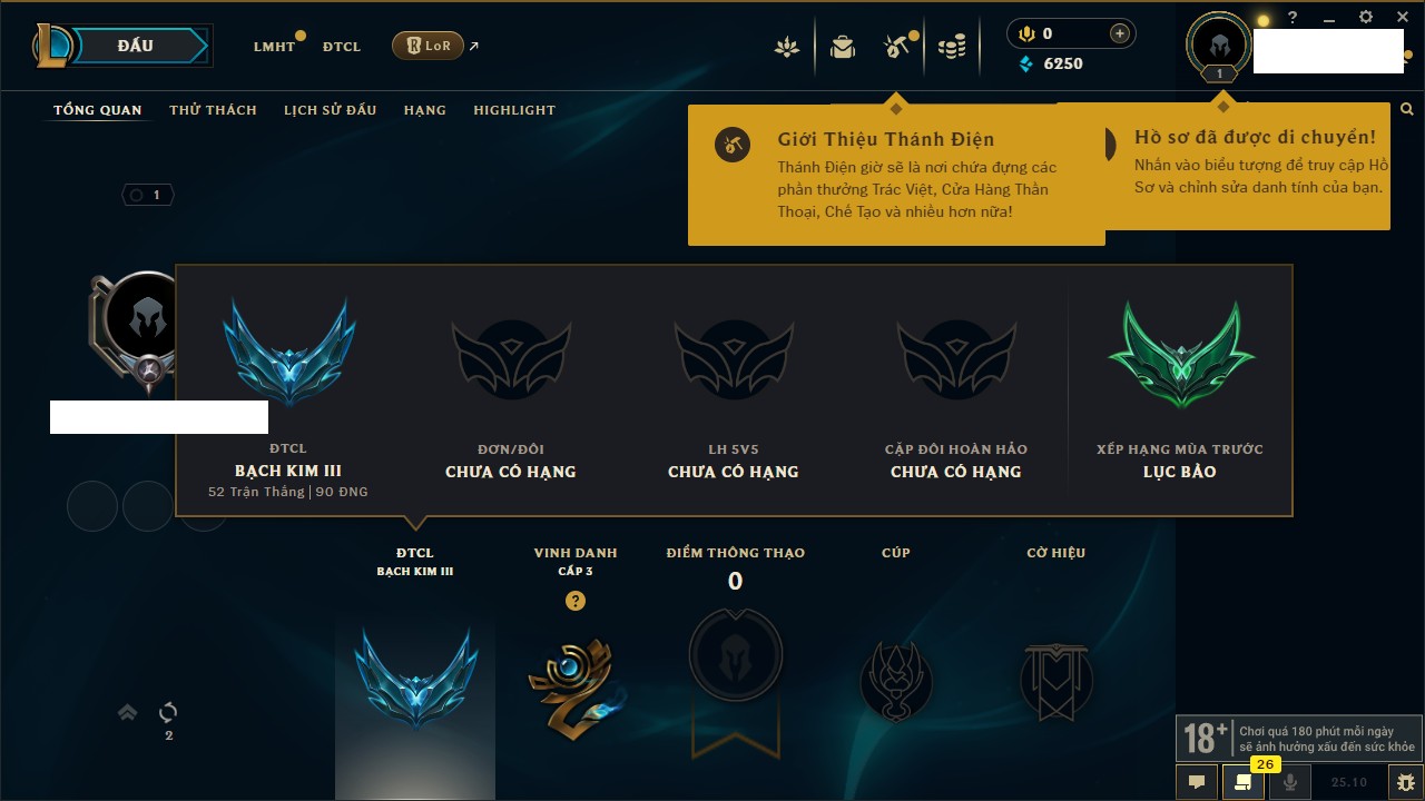 Rank Đơn: Lục Bảo IVKhung: VàngTướng: 171 - Còn 154648 THXTrang Phục: 203Rank ĐTCL: Bạch Kim IVLinh Thú: 69