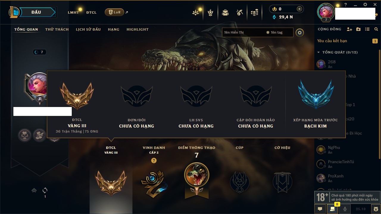 Rank Đơn: Lục Bảo IVKhung: VàngTướng: 171 - Còn 154648 THXTrang Phục: 203Rank ĐTCL: Bạch Kim IVLinh Thú: 69