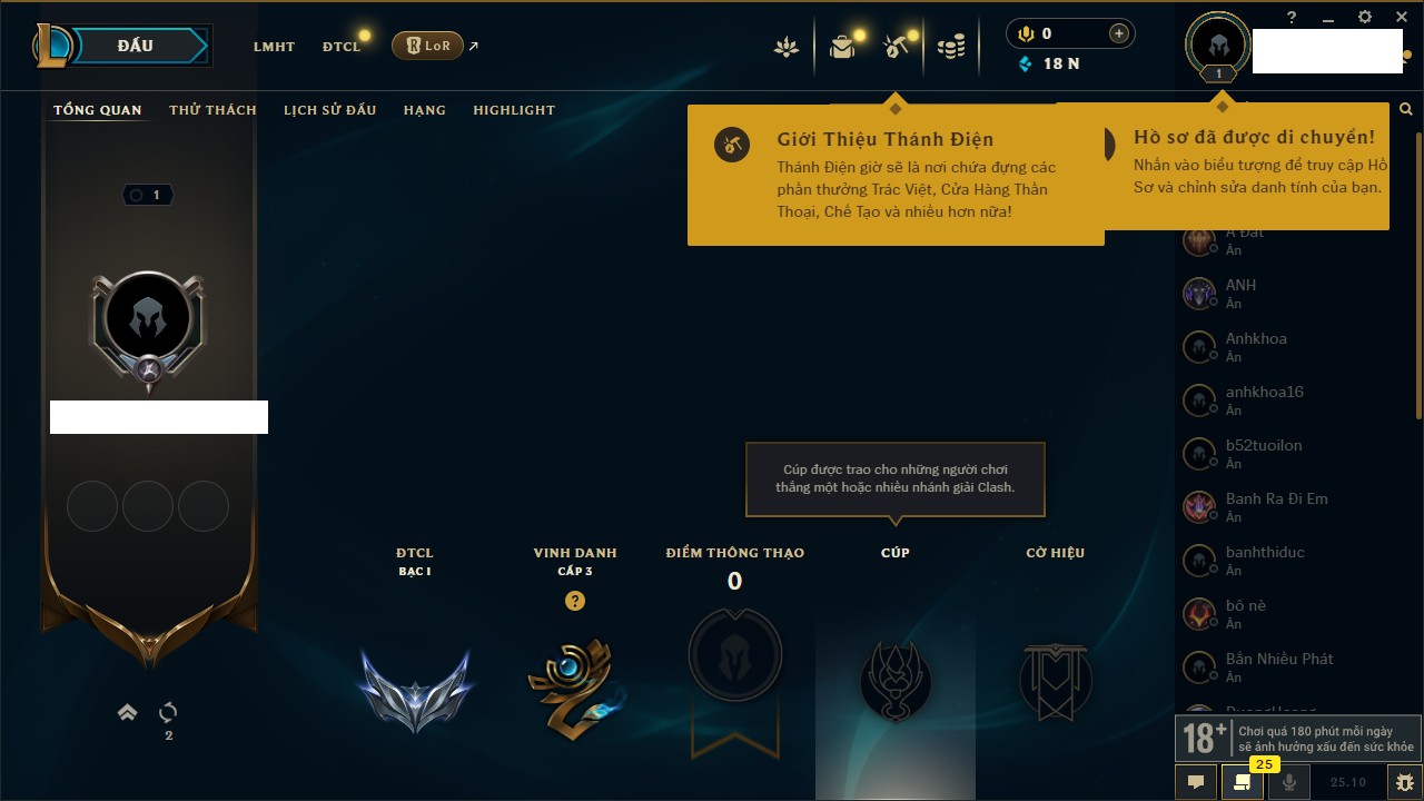 Rank Đơn: Vàng IKhung: BạcTướng: 171 - Còn 60584 THXTrang Phục: 286Rank ĐTCL: Vàng IIILinh Thú: 117
