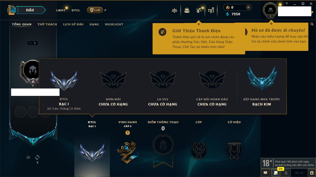 Rank Đơn: Bạc IIKhung: Chưa có khungTướng: 145 - Còn 12230 THXTrang Phục: 183Rank ĐTCL: Chưa RankLinh Thú: 71
