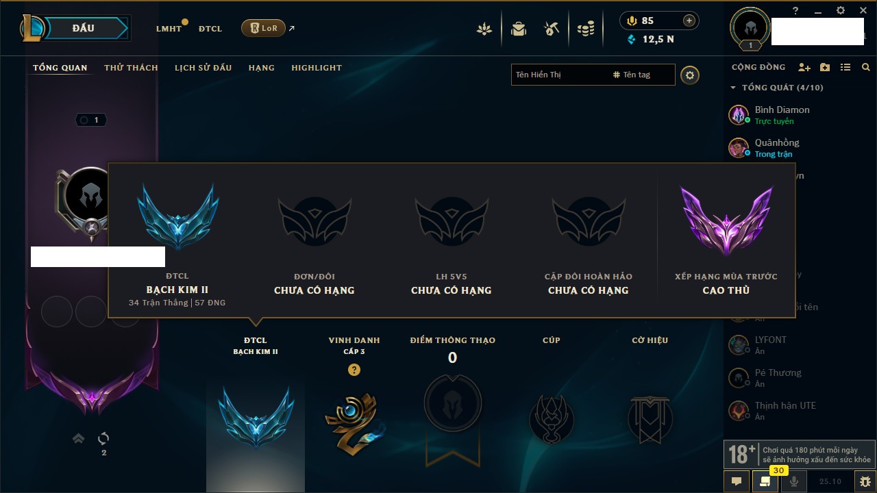 Rank Đơn: Bạch Kim IIIKhung: VàngTướng: 126 - Còn 23055 THXTrang Phục: 114Rank ĐTCL: Chưa RankLinh Thú: 21