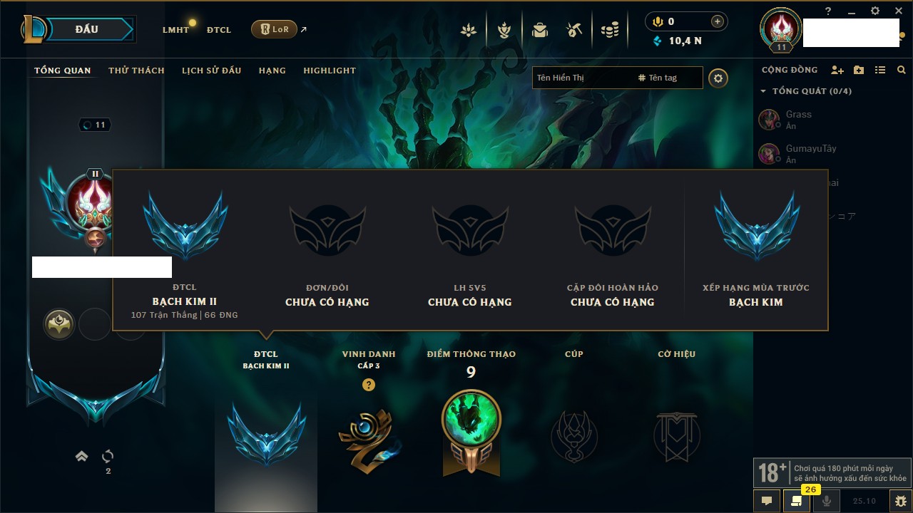 Rank Đơn: Bạch Kim IIIKhung: Bạch kimTướng: 171 - Còn 136108 THXTrang Phục: 261Rank ĐTCL: Bạc IVLinh Thú: 73