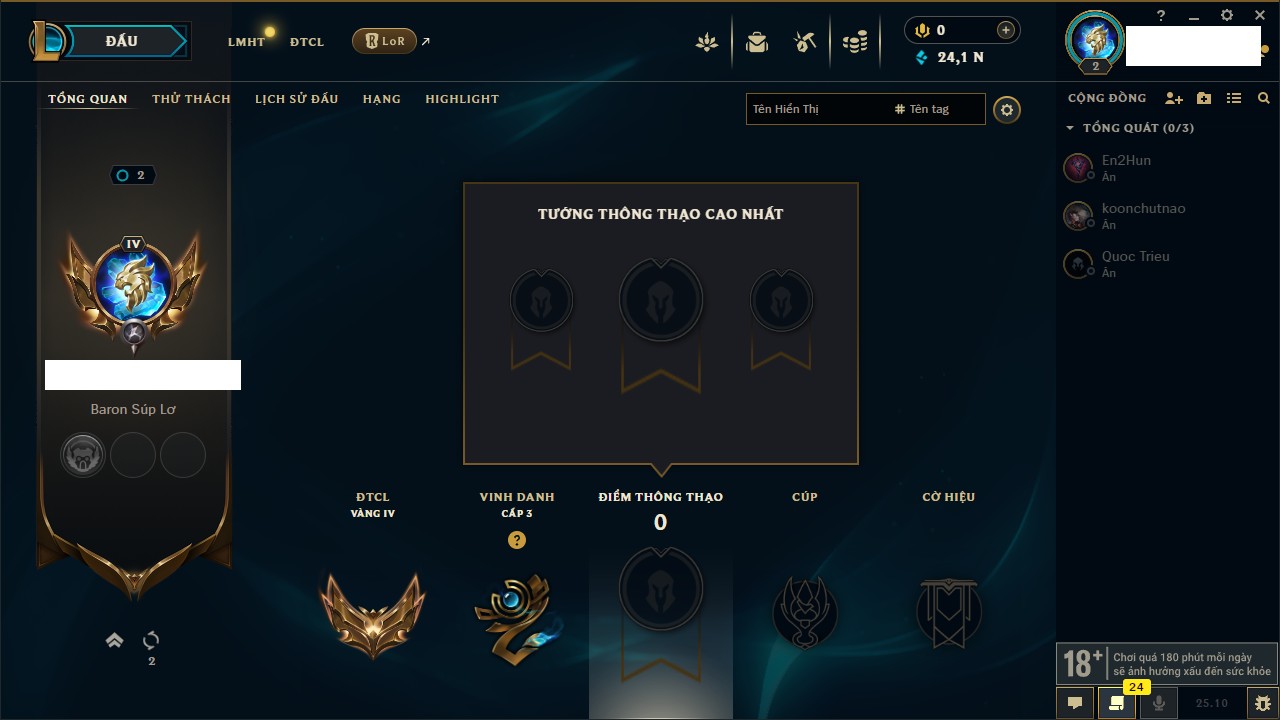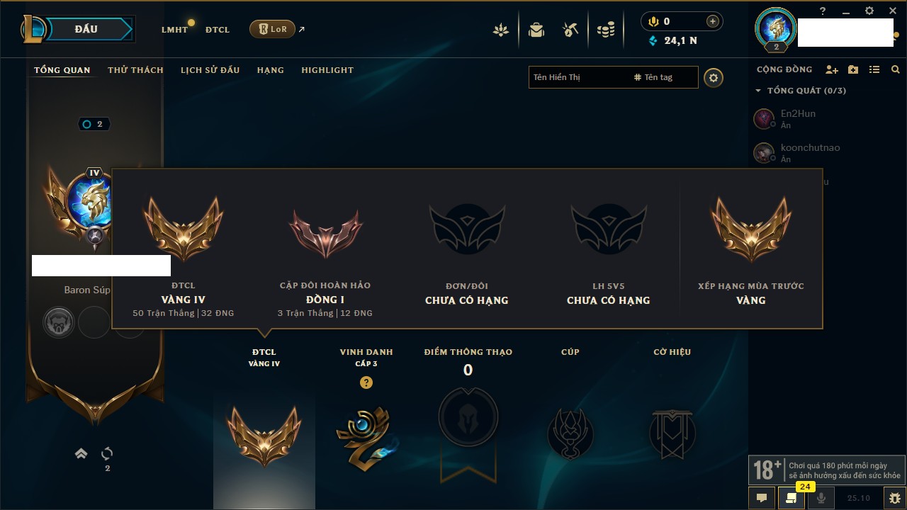 Rank Đơn: Lục Bảo IVKhung: VàngTướng: 171 - Còn 154648 THXTrang Phục: 203Rank ĐTCL: Bạch Kim IVLinh Thú: 69