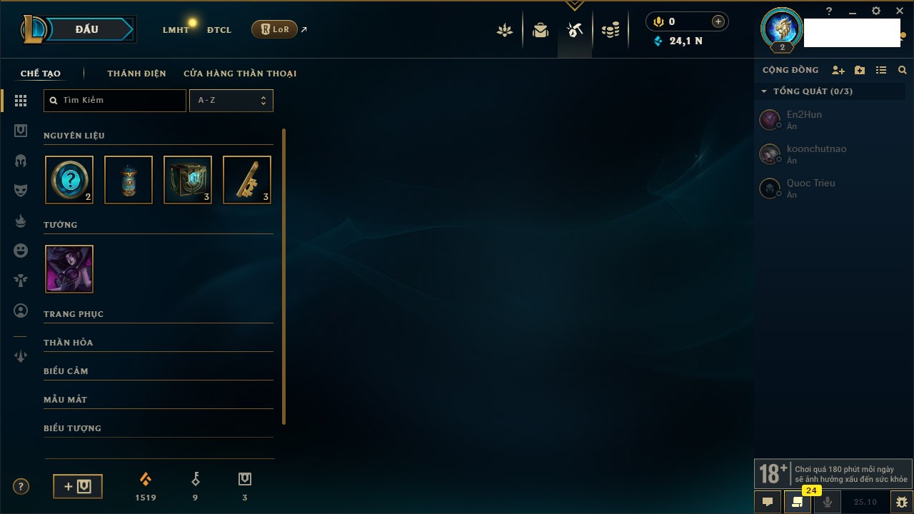Rank Đơn: Bạc IIIKhung: BạcTướng: 171 - Còn 190352 THXTrang Phục: 260Rank ĐTCL: Sắt IILinh Thú: 31
