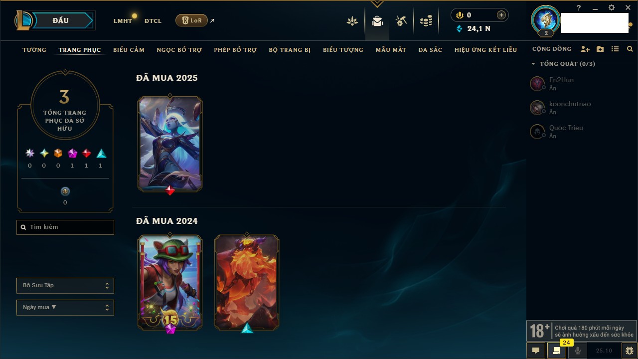 Rank Đơn: Vàng IIIKhung: VàngTướng: 172 - Còn 164704 THXTrang Phục: 255Rank ĐTCL: Kim Cương IVLinh Thú: 156