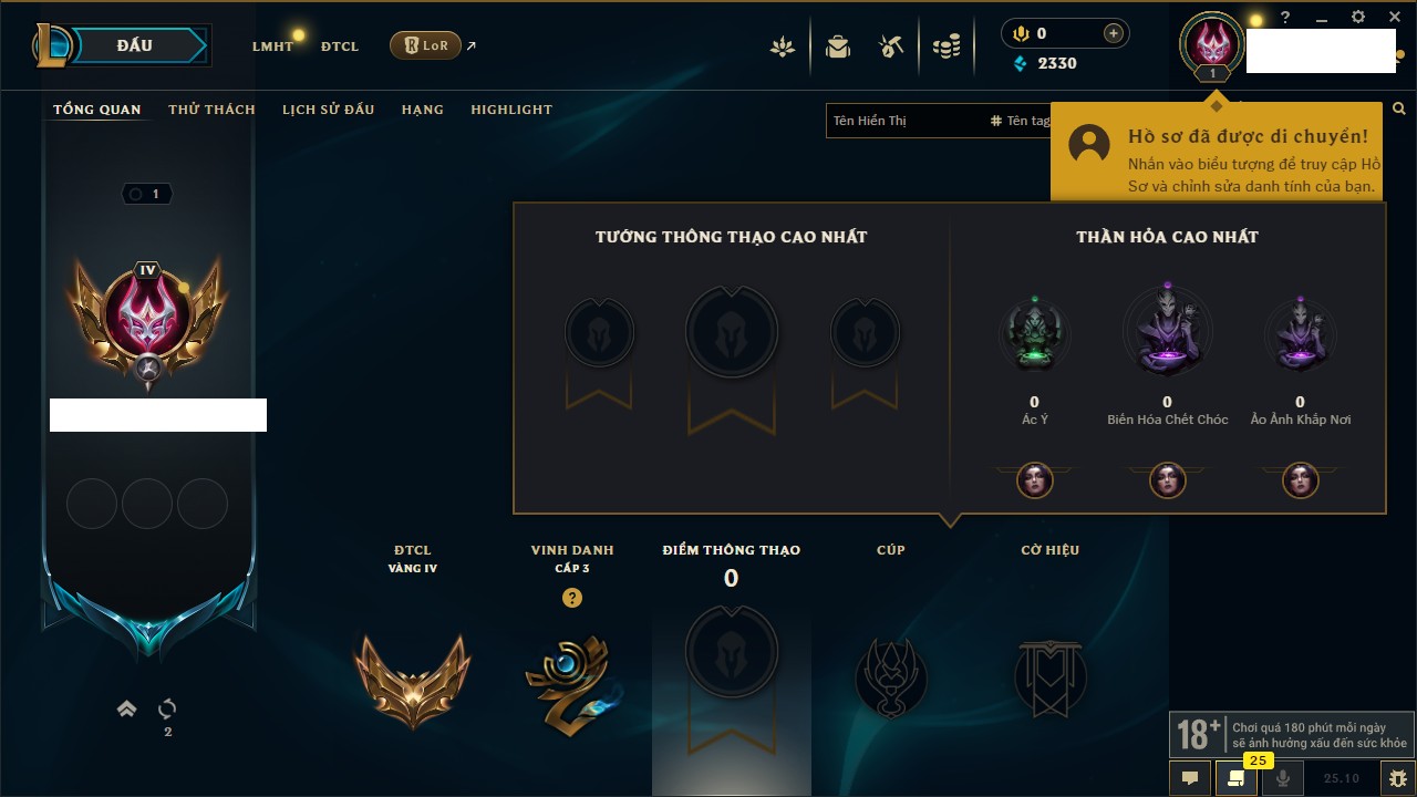 Rank Đơn: Chưa RankKhung: Chưa có khungTướng: 118 - Còn 13712 THXTrang Phục: 117Rank ĐTCL: Chưa RankLinh Thú: 34