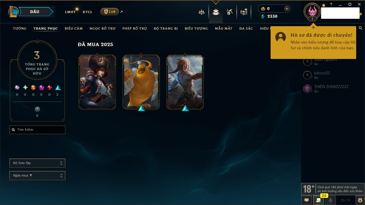 Rank Đơn: Chưa RankKhung: Chưa có khungTướng: 55 - Còn 6150 THXTrang Phục: 33Rank ĐTCL: Chưa RankLinh Thú: 9