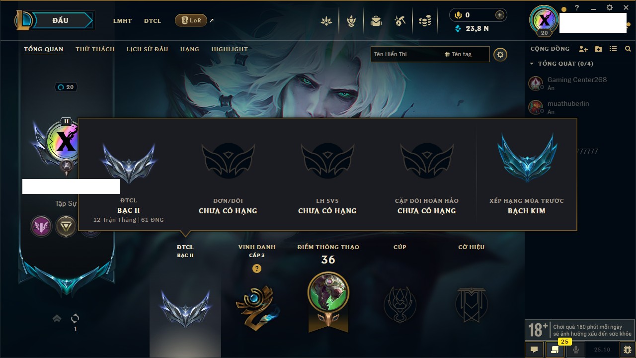 Rank Đơn: Bạc IIKhung: VàngTướng: 171 - Còn 332462 THXTrang Phục: 165Rank ĐTCL: Kim Cương IVLinh Thú: 181