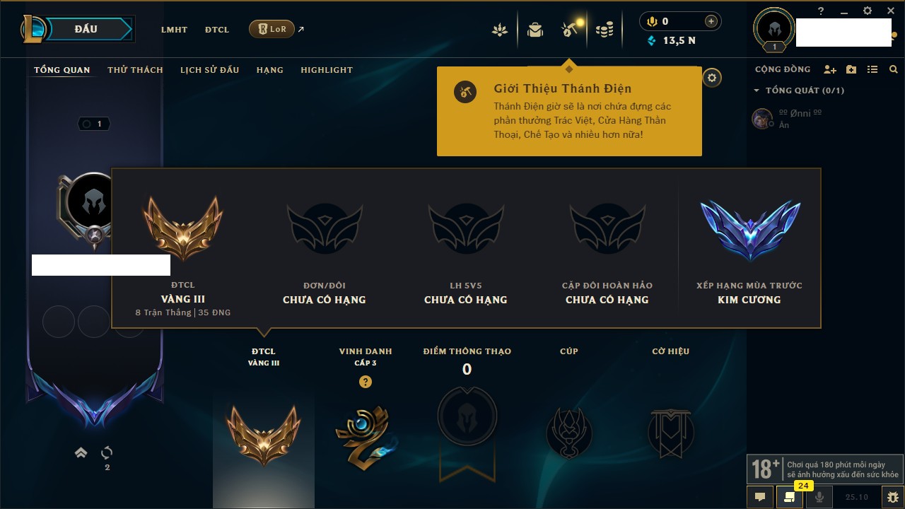 Rank Đơn: Vàng IKhung: BạcTướng: 171 - Còn 60584 THXTrang Phục: 286Rank ĐTCL: Vàng IIILinh Thú: 117