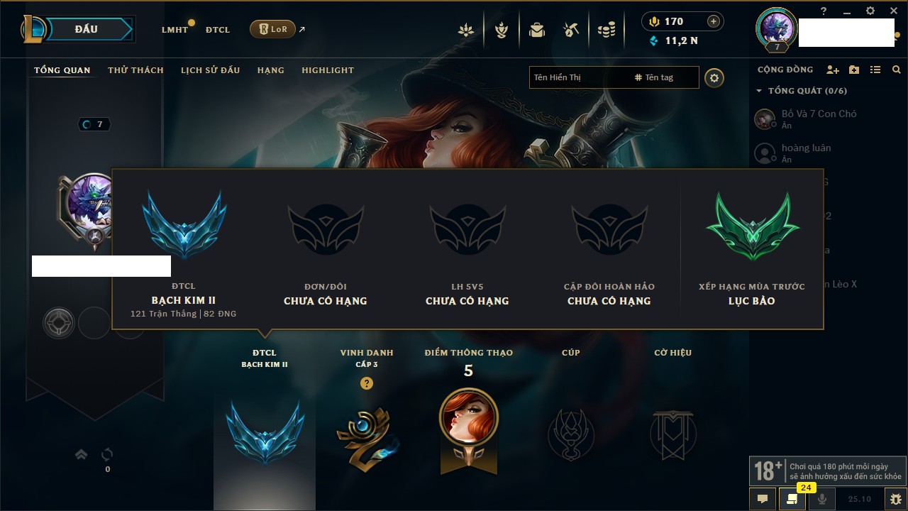 Rank Đơn: Đồng IIKhung: ĐồngTướng: 170 - Còn 66145 THXTrang Phục: 215Rank ĐTCL: Chưa RankLinh Thú: 52