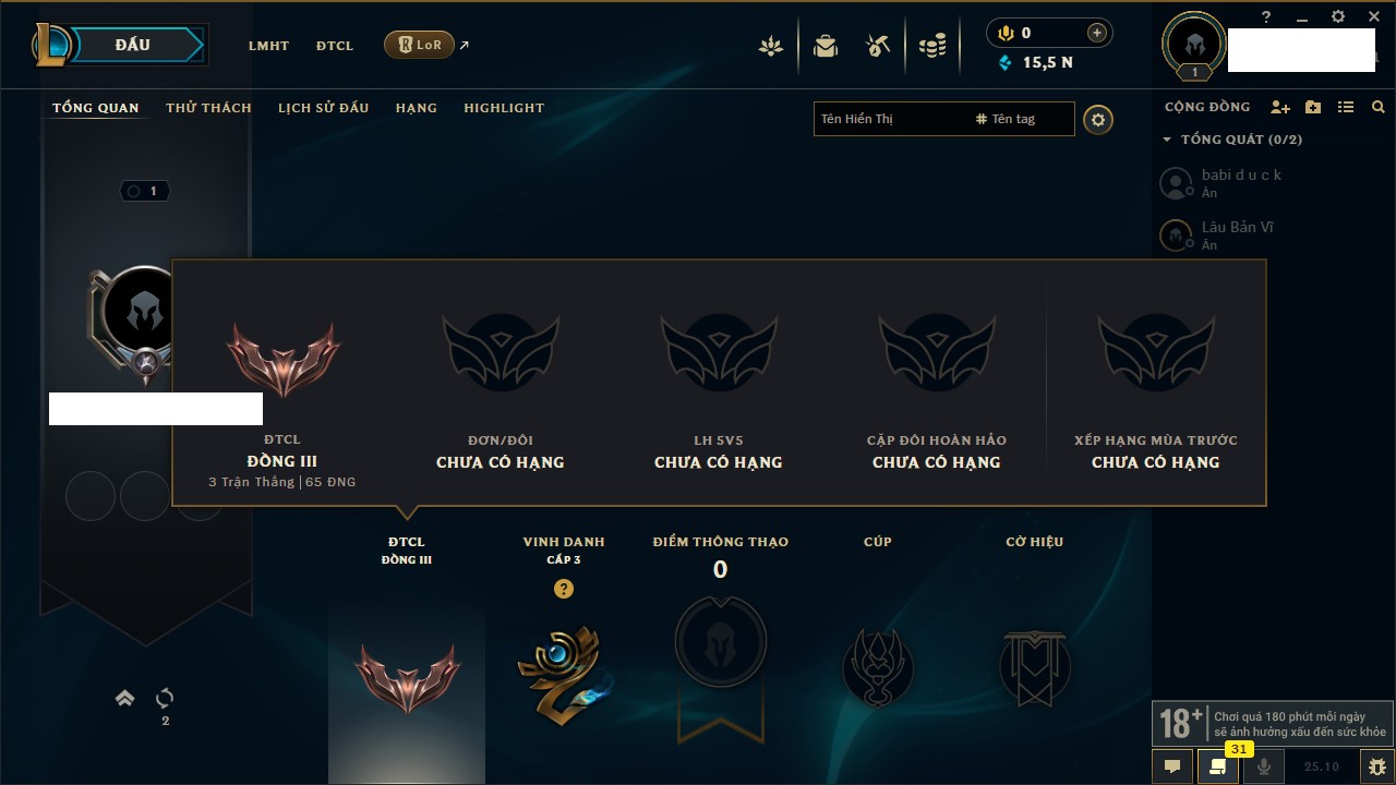 Rank Đơn: Vàng IKhung: BạcTướng: 171 - Còn 60584 THXTrang Phục: 286Rank ĐTCL: Vàng IIILinh Thú: 117