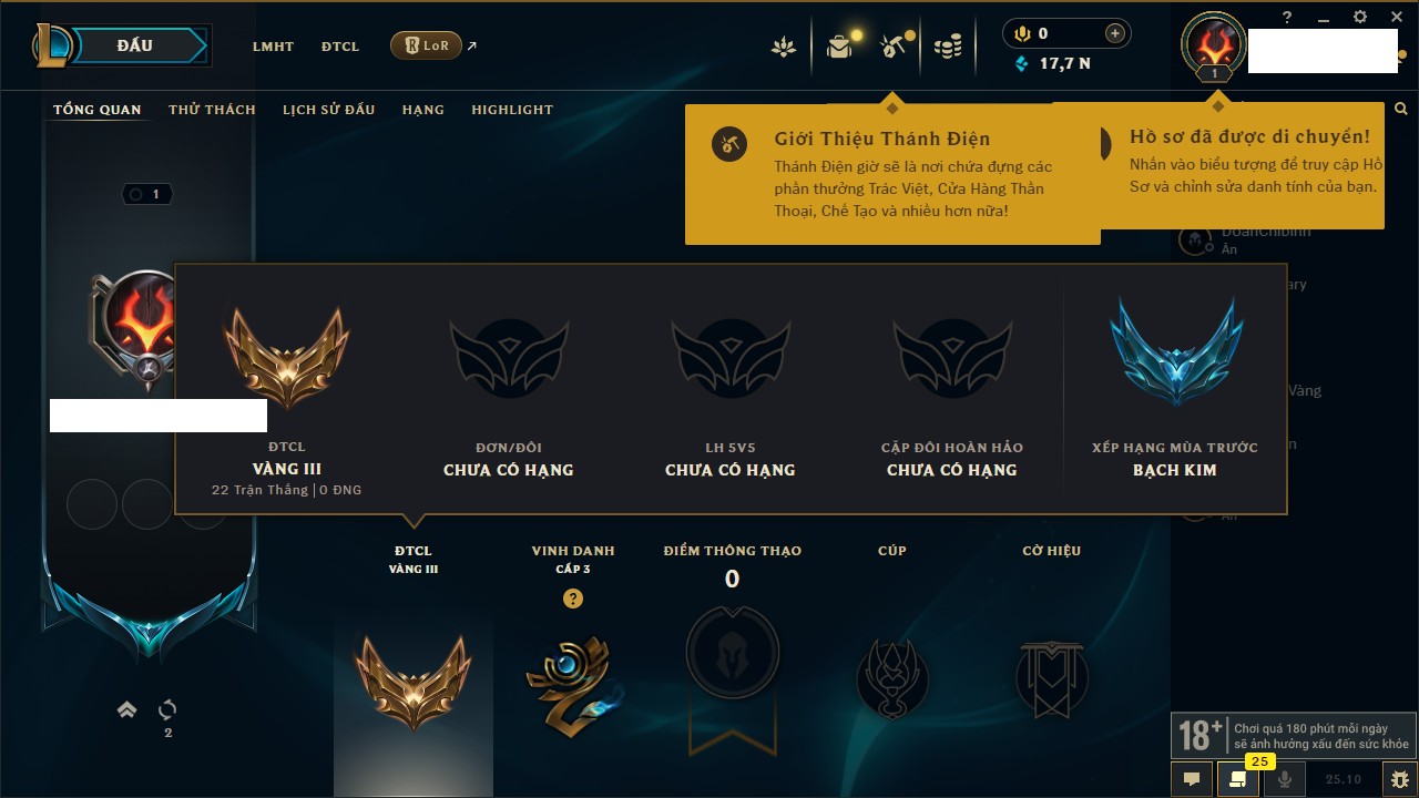 Rank Đơn: Vàng IKhung: BạcTướng: 171 - Còn 60584 THXTrang Phục: 286Rank ĐTCL: Vàng IIILinh Thú: 117