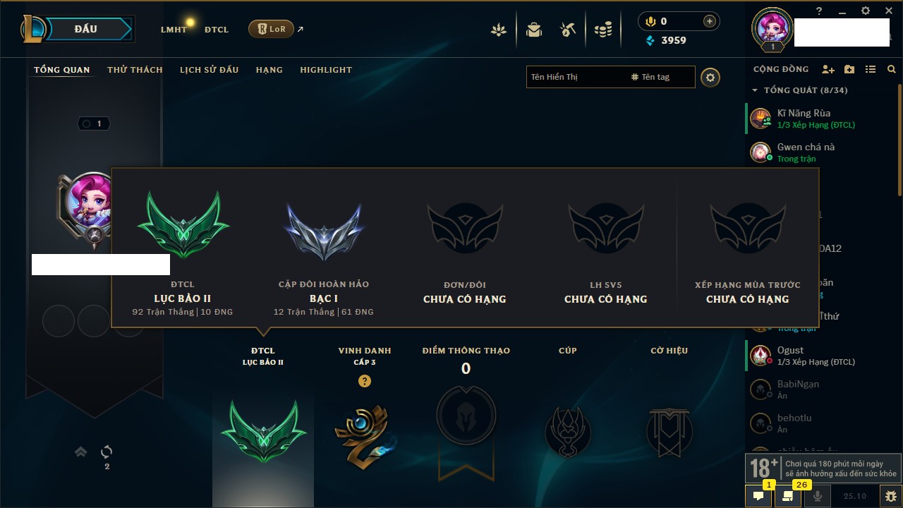 Rank Đơn: Vàng IKhung: BạcTướng: 171 - Còn 60584 THXTrang Phục: 286Rank ĐTCL: Vàng IIILinh Thú: 117