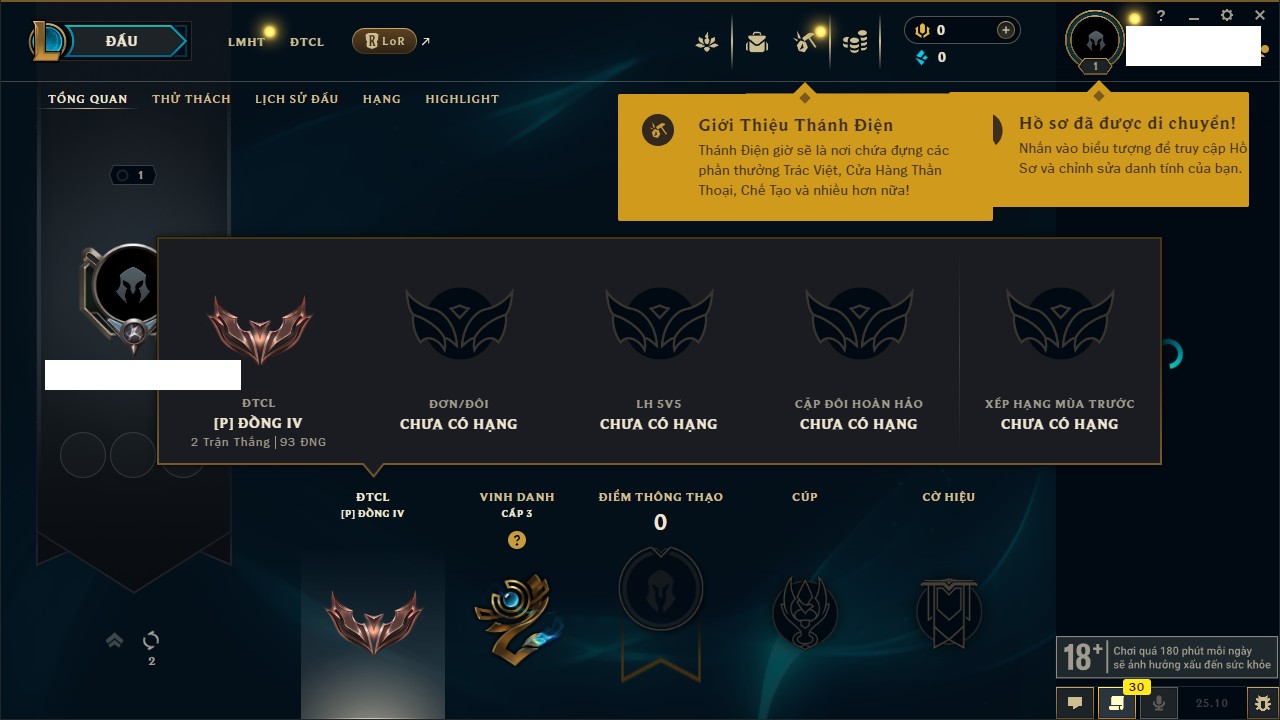 Rank Đơn: Sắt III Khung: Chưa có khung Tướng: 63 - Còn 185 THX Trang Phục: 8 Rank ĐTCL: Chưa Rank Linh Thú: 75