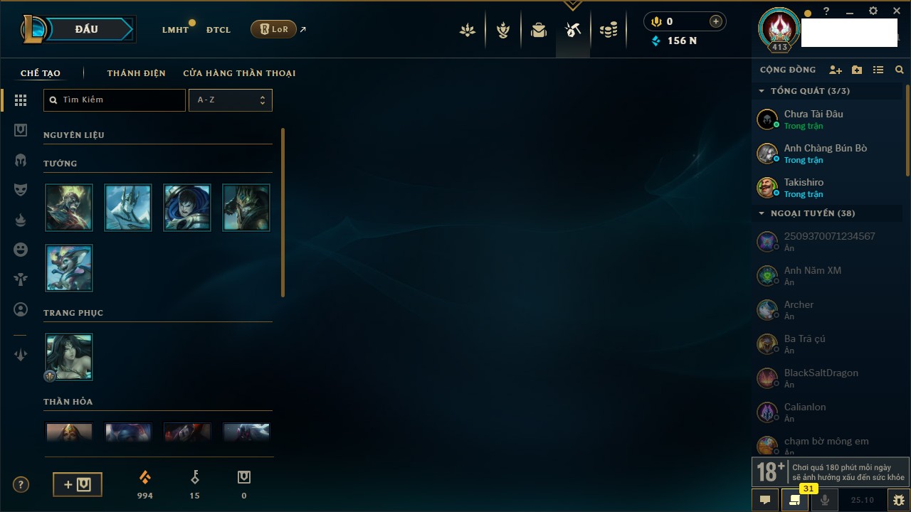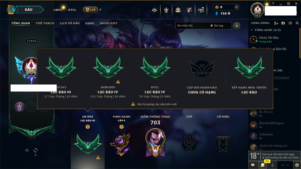 Rank Đơn: Vàng IKhung: BạcTướng: 171 - Còn 60584 THXTrang Phục: 286Rank ĐTCL: Vàng IIILinh Thú: 117