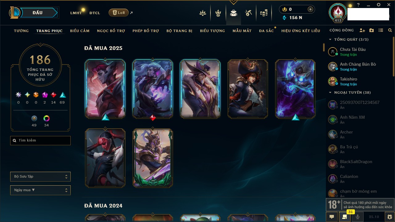 Rank Đơn: Vàng IIIKhung: VàngTướng: 171 - Còn 88128 THXTrang Phục: 329Rank ĐTCL: Chưa RankLinh Thú: 41