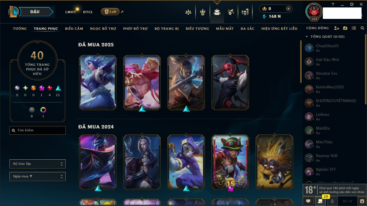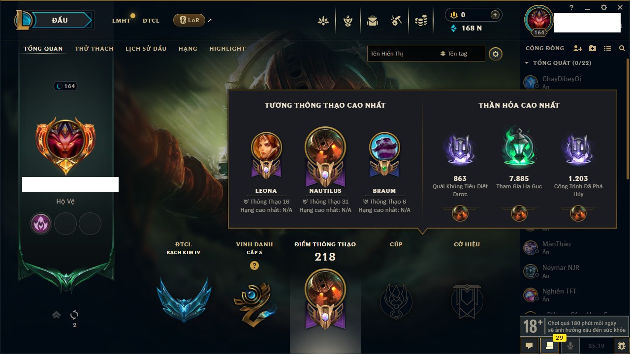 Rank Đơn: Đồng IKhung: ĐồngTướng: 168 - Còn 11447 THXTrang Phục: 245Rank ĐTCL: Chưa RankLinh Thú: 53