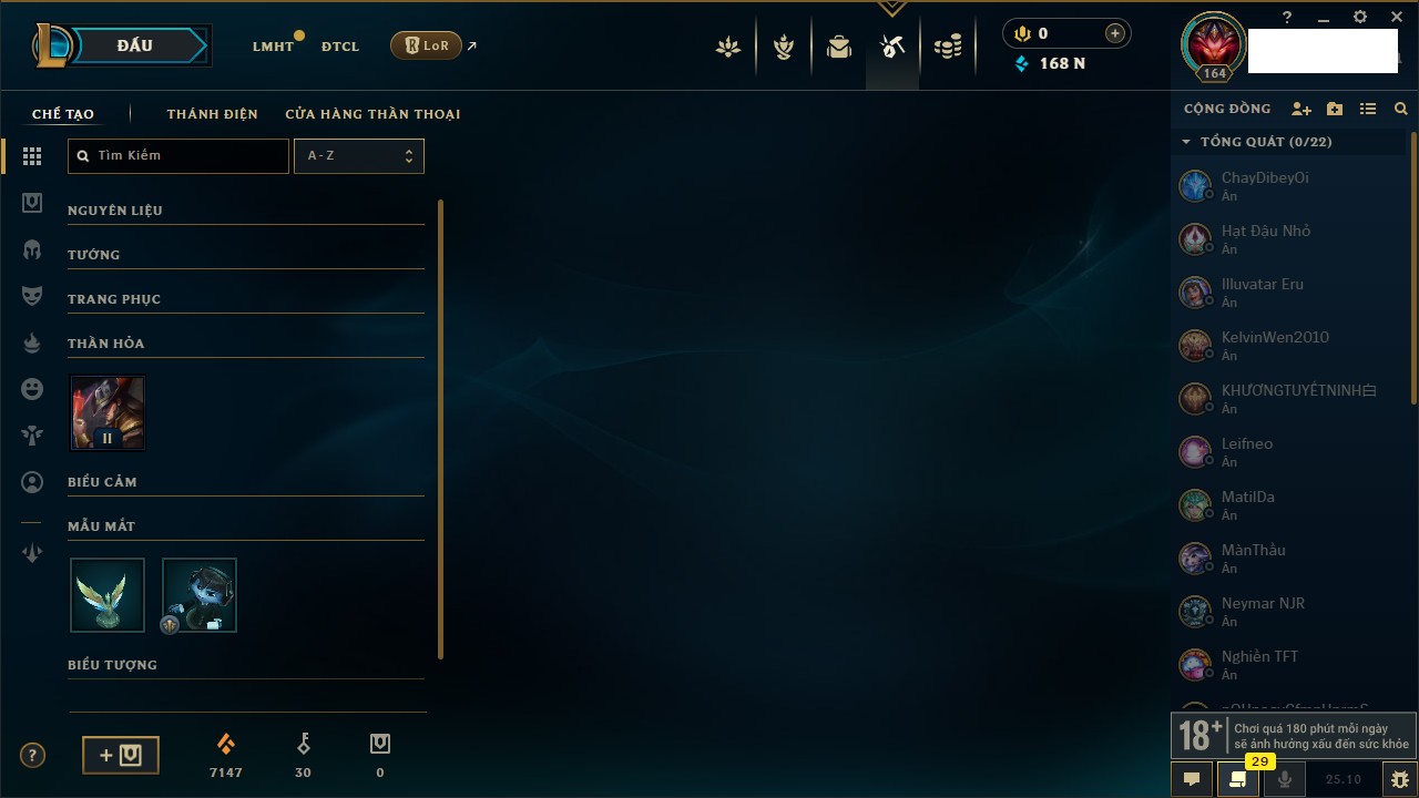 Rank Đơn: Vàng IIIKhung: BạcTướng: 171 - Còn 101359 THXTrang Phục: 88Rank ĐTCL: Kim Cương IVLinh Thú: 200