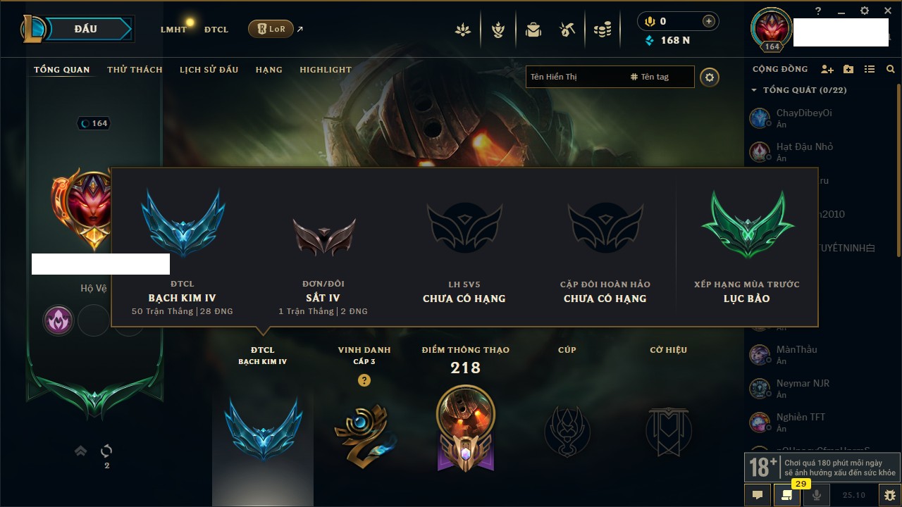 Rank Đơn: Đồng IIKhung: ĐồngTướng: 170 - Còn 66145 THXTrang Phục: 215Rank ĐTCL: Chưa RankLinh Thú: 52