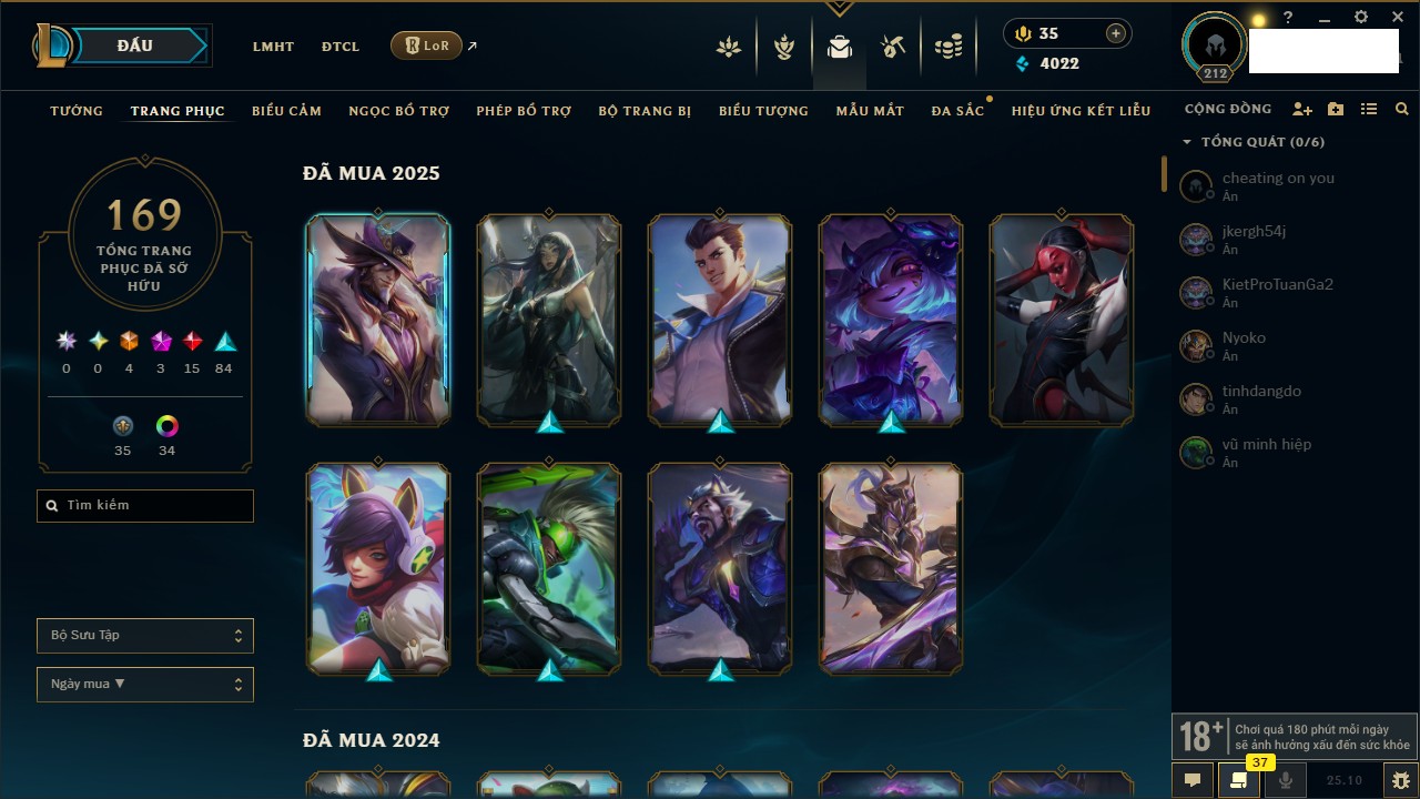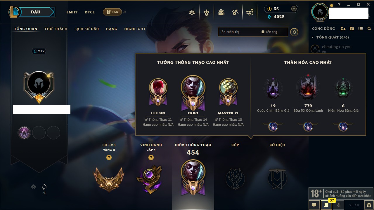 Rank Đơn: Bạch Kim IIKhung: Bạch kimTướng: 171 - Còn 316137 THXTrang Phục: 89Rank ĐTCL: Bạch Kim IIILinh Thú: 94